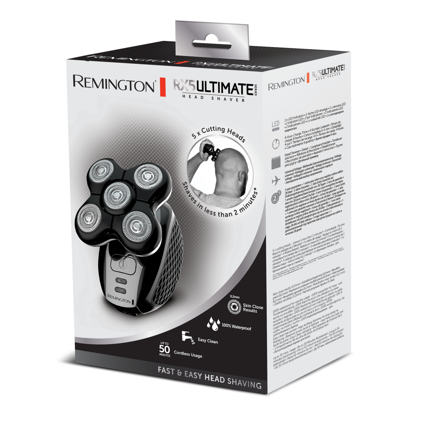 Ultimate Series RX5 Head Shaver- hiustenajokoneen 5 pyörivää kaksoisterää joustavalla alustalla myötäilevät pään muotoja täydellisesti tavoittaen jokaisen hiuksen. RX5 ajaa hiukset 60% laajemmalta alueelta verrattuna perinteisiin laitteisiin. Optimaalinen 0,2 mm lopputulos takaa huolettoman ajokokemuksen päänahkaa tai hiusnystyä vaurioittamatta.