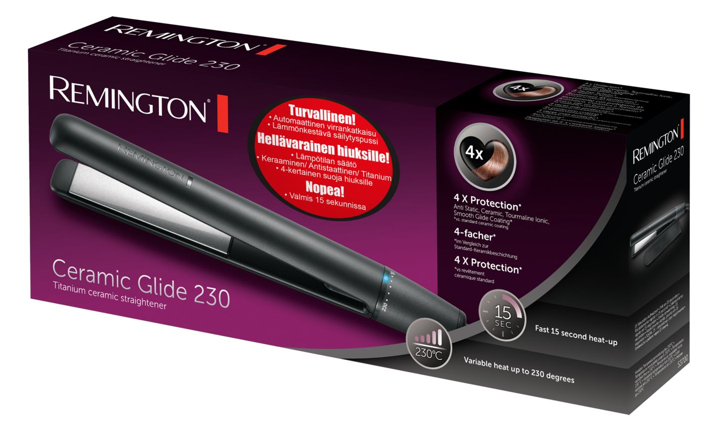Ceramic Glide 230 -muotoilurauta tarjoaa nelinkertaisen* suojan hiuksillesi, sillä sen suojapinnoitteisiin on nyt lisätty myös titaani. Hiukset saavat lisäkiiltoa ja ovat vähemmän sähköiset. Titaani tunnetaan erinomaisesta lämmönjohtavuudestaan, ja lämpö jakautuukin muotoilulevyille tasaisesti, niin että hiuksista tulee kiiltävät, sileät ja vähemmän sähköiset. Antistaattinen turmaliini-ionisointi ja keraamiseen pinnoitteeseen lisätyt liukumista helpottavat aineet varmistavat sen, että muotoilulevyt liukuvat hiuksissa ilman kitkaa, mikä suojaa niitä katkeilulta.