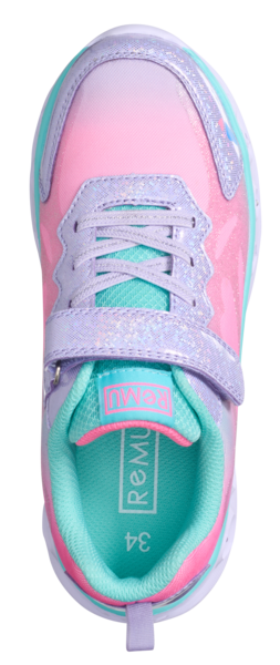 Lasten Remu River lenkkareiden pohjissa olevat valot vilkkuvat hauskasti kävellessä. Värikkäissä lenkkareissa on myös ripaus kimalletta. Vuori ja sisäpohjallinen ovat miellyttävää verkkoneulosta. Päällä olevan tarran ja venykenauhojen ansiosta lenkkarit on helppo pukea ja riisua.