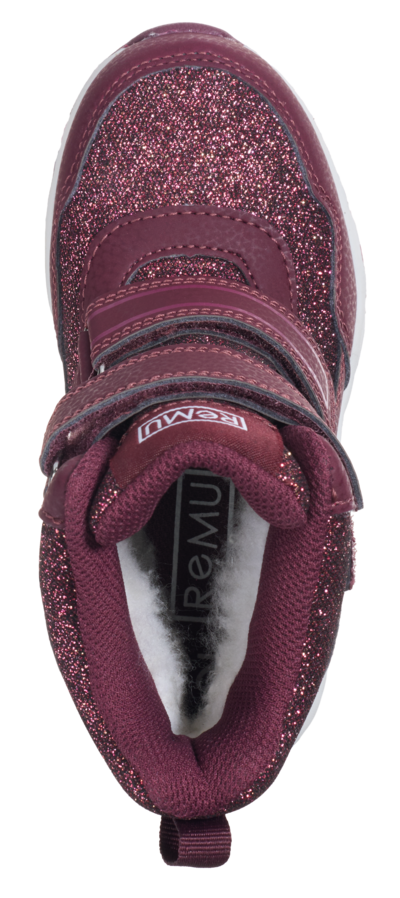 Lasten Remu Sheen vedenpitävissä talvikengissä on näyttävät glittertehosteet. Niissä on lämmin teddyvuori ja hyvin kuvioitu TPR-kuminen ulkopohja. Kaksi tarraa helpottaa kenkien pukemista ja säätämistä.