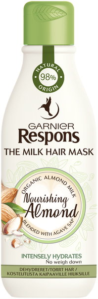Ensimmäinen 98% luonnollista alkuperää olevista ainesosista valmistettu Milk Hair Mask Garnierilta. Hoitavalla hiusnaamiolla on kevyt maitomainen koostumus. Garnier Respons on luonut intensiivisesti kosteuttavan maitomaisen koostumuksen, joka imeytyy hiuksiisi nopeasti. Koostumus sisältää: Espanjasta peräisin olevaa luomumantelimaitoa antamaan kosteutta sekä Meksikosta peräisin olevaa luomu-agavesiirappia. Ihana, kullanvärinen nektari tunnetaan elvyttävistä ominaisuuksistaan. Koe välitön muutos hiuksissa. 1) Levitä tyvestä latvoihin. 2) Ei tarvitse antaa vaikuttaa vaan voit huuhdella hiuksesi heti. Tulos: Helposti selvitettävät, tyvestä latvoihin vahvemman tuntuiset hiukset niitä latistamatta. Ilman silikonia luonnollisen tunteen aikaansaamiseksi. Hiukset tuoksuvat raikkailta ja herkullisilta. Säilytettävä lasten ulottumattomissa. Jos tuotetta joutuu silmiin, huuhtele ne välittömästi. Ei saa niellä.