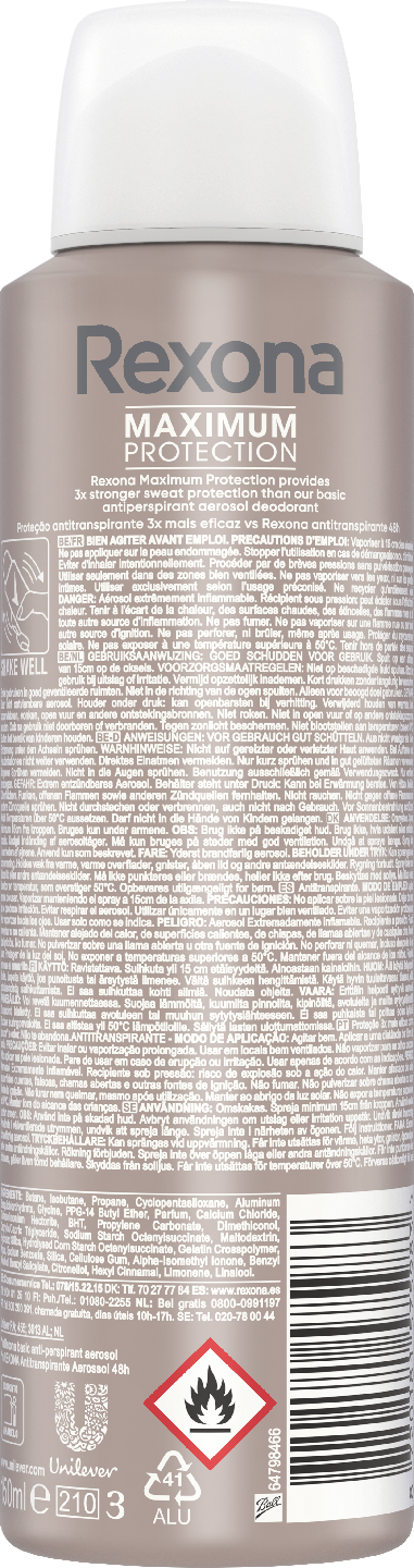 Rexona Maximum Protection Clean Scent Antiperspirantti Deodorantti Spray on yksi Rexonan edistyneimmistä ja pitkävaikutteisimmista hikoilua torjuvista antiperspirantti-deodoranteista. Se on deodorantti, joka on kehitetty torjumaan voimakasta hikoilua ja pahaa hajua jopa 96 tunnin ajan. Rexona Maximun Protection Clean Scent antiperspirantti on erittäin tehokas - se antaa yli kolme kertaa tehokkaamman suojan voimakasta hikoilua vastaan kuin tavalliset antiperspiranttimme! Samalla se on riittävän hellävarainen käytettäväksi joka päivä. Rexona Maximum Protection Clean Scent -deodorantissa on puhdas ja raikas tuoksu. Rexonan deodorantit on erityisesti suunniteltu toimimaan yhtä tehokkaasti kuin sinäkin. Me Rexonalla haluamme tietää entistä enemmän hikoilusta ja työmme tulokset ohjaavat kaikkia tuoteinnovaatioitamme. Motionsense™ -teknologiamme inspiraationa toimivat ihmiskehon liikkeet. Maximum Protection -tuotteemme auttavat todistetusti liialliseen hikoiluun silloin kun tarve on suurin. Invisible-sarjamme taas auttaa suojaamaan vaatteitasi valkoisilta ja kellertäviltä tahroilta. Olit siis vuorikiipeilemässä, juoksemassa bussipysäkille, pitämässä esitystä asiakkaille tai matkalla treffeille, voit luottaa siihen, että sinulla on tehokas suoja hikoilua vastaan. Käytä näin: suihkuta kuivalle iholle käsivarsien alle. Se on siinä! Parhaan vaikutuksen saavuttamiseksi käytä Rexona Maximum Protection Clean Scent -tuoksua ennen nukkumaanmenoa. Rexona Maximum Protection Clean Scent -tuoksua voit käyttää jälleen uudelleen aamulla. Clean Scent -deodorantti on osa Maximum Protection -sarjaa – Rexonan tehokkaimpia antiperspirantteja, jotka suojaavat sinua hikoilulta ja hajuilta 96 tunnin ajan. Rexona – Se ei petä sinua.