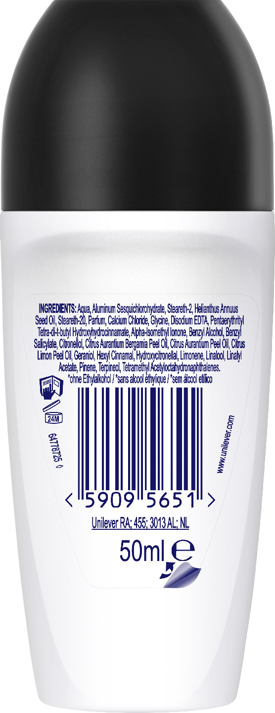 Rexona 48h Invisible Black&White Roll-on on antiperspirantti deodorantti roll-on naisille. Se antaa tehokkaan suojan hikoilua ja hajuja vastaan jopa 48 tunnin ajaksi. Se auttaa myös suojaamaan vaatteita värjäytymiltä kainaloista: valkoisia läikkiä mustissa vaatteissa ja vaaleiden vaatteiden keltaisia tahroja. Mustat vaatteet pysyvät mustina ja valkoiset valkoisina. Unohda hikoilu ja hienhaju. Nauti deodorantin puhtaasta ja raikkaasta tuoksusta. Rexona 48h Invisible Black&White Roll-on antiperspirantti deodorantti suojaa hikoilulta pitkäkestoisesti – jopa kaksi vuorokautta. Levitä Rexonaa käsivarsien alle kainaloiden iholle ja nauti suihkunraikkaasta olosta. Olemme kaikki erilaisia ja hikoilemme eri tavalla. Runsas hikoilu voi tuntua päivittäiseltä kamppailulta, mutta se ei ole ongelma Rexonan antiperspirantille. Riippumatta siitä mitä teet elämässäsi – kiipeät vuorille, juokset bussille, pidät esityksen kollegoille tai menet treffeille – voit luottaa siihen, että sinulla on paras suoja kosteutta ja pahaa hajua vastaan. Meidän tärkein tehtävämme Rexonalla on tietää kaikki hikoilusta. Se, mitä opimme ja tiedämme, johtaa jatkuvasti uusiin tuoteinnovaatioihin. Mitä tahansa päivässäsi tapahtuukaan, sinä olet siihen valmis! Kävelymatka töihin sekä juhlat illemmalla. Asun valitseminen, joka sopii molempiin, on vaikeaa. Mutta antiperspirantin valitseminen ei ole – Rexona naisten antiperspirantit. Joko tunnet Rexonan Maximum Protection antiperspirantit? Rexona on kehittänyt mullistavan Defence+-teknologian. Se muodostaa ihollesi mikrosuojan, joka suojaa sinua hienhajulta 96 tunnin ajan. Sen ansiosta Maximum Protection-antiperspiranttimme on kolme kertaa tavallista antiperspiranttia vahvempi. Kokeile esimerkiksi : Rexona Maximum Protection Clean Scent stick..