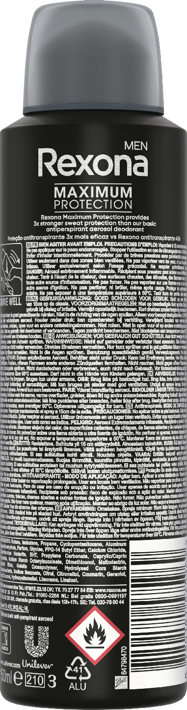 Rexona Men Maximum Protection Cobalt Dry -deodoranttisuihke on yksi Rexonan edistyneimmistä ja pitkävaikutteisimmista hikoilua torjuvista deodoranteista. Rexona Men Maximum Protection Cobalt Dry Antiperspirantti Deodorantti Spray on miehille tarkoitettu antiperspirantti, joka on kehitetty torjumaan voimakasta hikoilua ja pahaa hajua ja jonka tarjoama suoja kestää jopa 96 tunnin ajan. Suihkedeodorantti on kolme kertaa tehokkaampi kuin tavalliset antiperspiranttimme. Samalla se on riittävän hellävarainen käytettäväksi joka päivä. Rexona Men Maximum Protection Cobalt Dry -deodorantissa on puhdas ja raikas tuoksu – piparminttua ja häivähdys myskiä. Tämä miesten Rexona deodorantti on dermatologisesti testattu ja sisältää kosteuttavia ainesosia sekä Rexonan kehittämän ainutlaatuisen koostumuksen, joka taistelee hikeä ja pahoja hajuja vastaan. Rexonan deodorantit on erityisesti suunniteltu toimimaan yhtä tehokkaasti kuin sinäkin. Me Rexonalla haluamme tietää entistä enemmän hikoilusta ja työmme tulokset ohjaavat kaikkia tuoteinnovaatioitamme. Motionsense™ -teknologiamme inspiraationa toimivat ihmiskehon liikkeet. Maximum Protection -tuotteemme auttavat todistetusti liialliseen hikoiluun silloin kun tarve on suurin. Invisible-sarjamme taas auttaa suojaamaan vaatteitasi valkoisilta ja kellertäviltä tahroilta. Clean Scent -tuoksu puolestaan tarjoaa puhtaan tuoksun. Olit sitten käymässä salilla, pistäytymässä pubissa tai matkalla tapaamaan ystäviä, voit luottaa siihen, että tämä dödö tarjoaa sinulle tehokkaan suojan hikoilua vastaan. Käytä näin: suihkuta kuivalle iholle käsivarsien alle. Se on siinä! Rexona Men Maximum Protection Cobalt Dry -deodorantti antaa upean tuoksun kuin body spray. Cobalt Dry -tuoksu on osa Maximum Protection -sarjaa – Rexonan tehokkaimpia antiperspirantteja, jotka suojaavat sinua hikoilulta ja hajuilta 96 tunnin ajan. Rexona – Se ei petä sinua.