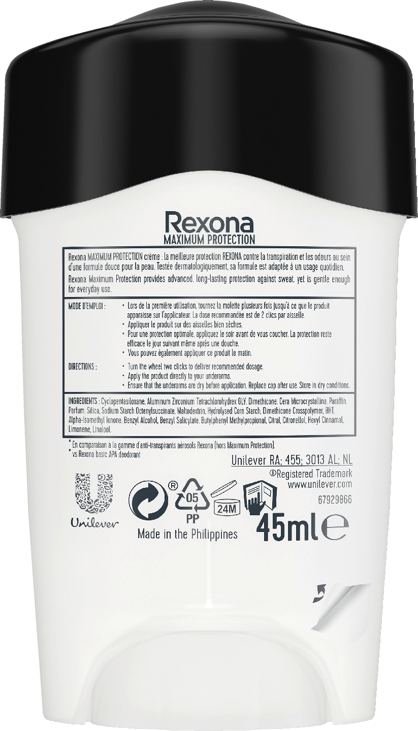 Uusi parannettu Rexona Maximum Protection -suojaus Defence™ -teknologialla, joka antaa sinulle kolme kertaa tehokkaamman suojan hikoilua vastaan normaaliin antiperspiranttiin verrattuna. Patentoitu Defence™ -teknologiamuodostaa 96 tuntia kestävän suojan. Tuoreen omenan ja rahoittavan jasmiinin tuoksu, jossa häivähdys ruusua.