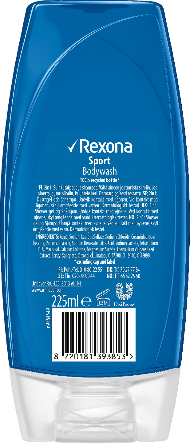 Rexona for Men Sport -suihkusaippua on virkistävä ja raikas suihkusaippua ja shampoo. Rexona for Men Sport tarjoaa urheilullisen raikkauden virkistäen kehosi sekä mielesi. Rexona for Men Sport -suihkugeelillä peset vartalosi raikkaan puhtaaksi päästä varpaisiin. Sporttisella Rexonalla saat puhtaaksi sekä hiukset että vartalon. Et tarvitse erillistä shampoota – kätevää, vai mitä! Rexona for Men Sport 2in1 on helppo ottaa mukaan esimerkiksi urheilukassiin, kun menet liikuntasalille. Rexona for Men Sport on suihkugeeli miehille, jonka urheilullinen tuoksu virkistää ja voimauttaa. Käytä näin: Kastele hiukset ja iho ennen suihkugeelin levittämistä. Hiero iholle ja hiuksiin, vaahdota kevyesti. Huuhtele huolellisesti. Tiesitkö, että yli 10 miljoonaa bakteeria elää kainaloissasi. Siksi saippua yksin ei riitä suojaamaan sinua pahoilta hajuilta. Kehomme epämiellyttävät hajut syntyvät iholla olevista bakteereista, jotka hajottavat hikeämme hapoiksi. Kainalomme ovat otollinen ympäristö bakteereille. Paras tapa estää hienhajua on puuttua sen syihin: bakteereihin. Rexonan suihkusaippuat, deodorantit ja antiperspirantit on suunniteltu aktiiviseen elämään. Rexonalla meidän tärkein tehtävämme on tietää kaikki hikoilusta. Se, mitä opimme, johtaa jatkuvasti uusiin tuoteinnovaatioihin. Joten riippumatta siitä, mitä teet elämässäsi – kiipeät vuorille, juokset bussille, pidät esityksen kollegoille tai menet treffeille – voit luottaa siihen, että Rexona antaa virkistävän lähdön päivään ja parhaan suojan hikoilua vastaan. Rexona on alan edelläkävijä. Tästä on esimerkkinä mm. antiperspiranteistamme, kuten Rexona Cobalt antiperspirantti, tuttu ainutlaatuinen MotionSense ™ -teknologia, joka reagoi kehon liikkeisiin. Mitä vauhdikkaammin liikut, sitä enemmän se suojaa hikoilulta.