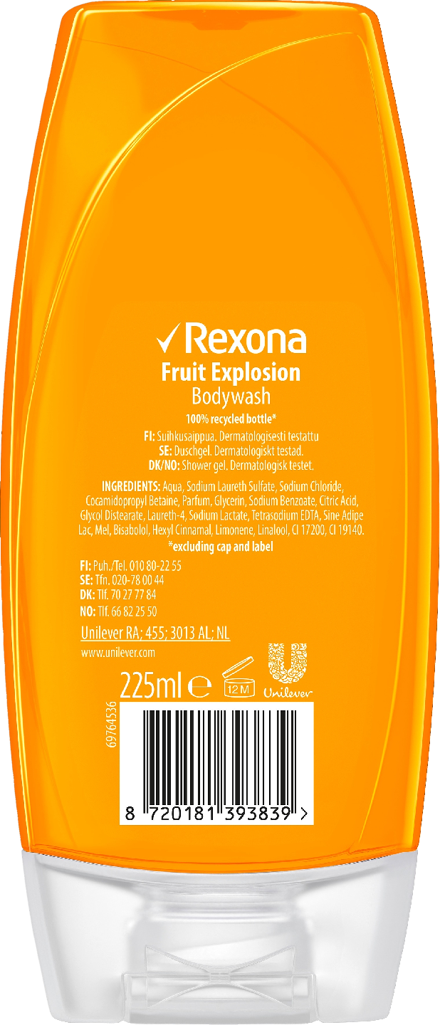 Rexona Fruit Explosion on hedelmäisen raikas suihkusaippua! Rexona Fruit Explosion puhdistaa ihosi jättäen sen hedelmäisen raikkaaksi. Rexona Fruit Explosion suihkugeeli on raikkaan hedelmäinen suihkusaippua koko vartalolle. Se takaa raikkaan, huumaavan tuoksuisen ja pehmeän olon iholle koko päiväksi. Herättele aistisi aamuun energisellä Rexona Fruit Explosion -suihkugeelillä. Sen aidot hedelmäuutteet yhdistettynä kasvipohjaisiin ainesosiin ovat kuin piristysruiske ihollesi. Iho peseytyy puhtaaksi ja se myös tuntuu pesun jälkeen eloisalta. Rexona Fruit Explosion on iholle pH-neutraali – puhdistaa kuivattamatta ihoa. Käytä näin: Käytä suihkussa tai kylvyssä. Levitä suihkusaippuaa vartalolle ja huuhtele lämpimällä vedellä. Sopii päivittäiseen käyttöön. Tiesitkö, että yli 10 miljoonaa bakteeria elää kainaloissasi. Siksi saippua yksin ei riitä suojaamaan sinua pahoilta hajuilta. Kehomme epämiellyttävät hajut syntyvät iholla olevista bakteereista, jotka hajottavat hikeämme hapoiksi. Kainalomme ovat otollinen ympäristö bakteereille. Paras tapa estää hienhajua on puuttua sen syihin: bakteereihin. Rexonan suihkusaippuat, deodorantit ja antiperspirantit on suunniteltu aktiiviseen elämään. Rexonalla meidän tärkein tehtävämme on tietää kaikki hikoilusta. Se, mitä opimme, johtaa jatkuvasti uusiin tuoteinnovaatioihin. Joten riippumatta siitä, mitä teet elämässäsi – kiipeät vuorille, juokset bussille, pidät esityksen kollegoille tai menet treffeille – voit luottaa siihen, että Rexona antaa virkistävän lähdön päivään ja parhaan suojan hikoilua vastaan. Rexona on alan edelläkävijä. Tästä on esimerkkinä mm. antiperspiranteistamme, kuten Rexona Biorythm antiperspirantti, tuttu ainutlaatuinen MotionSense ™ -teknologia, joka reagoi kehon liikkeisiin. Mitä vauhdikkaammin liikut, sitä enemmän se suojaa hikoilulta.