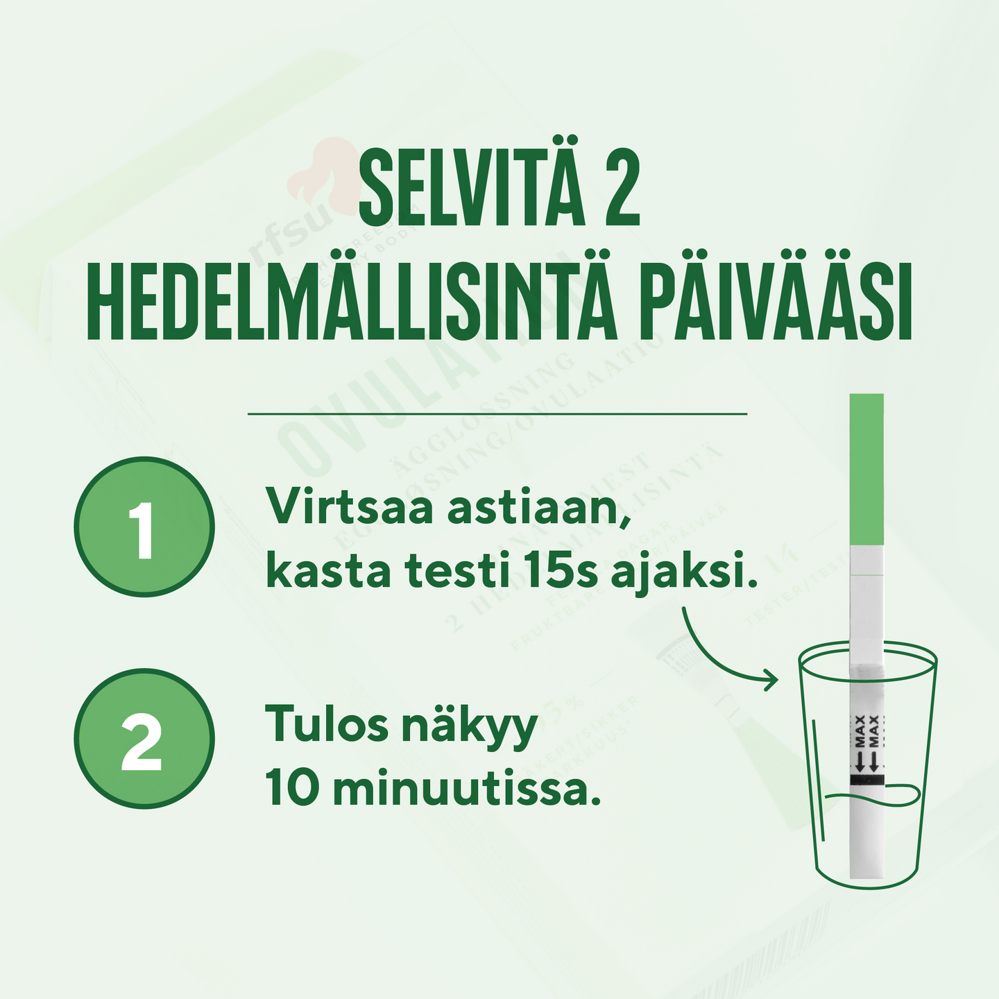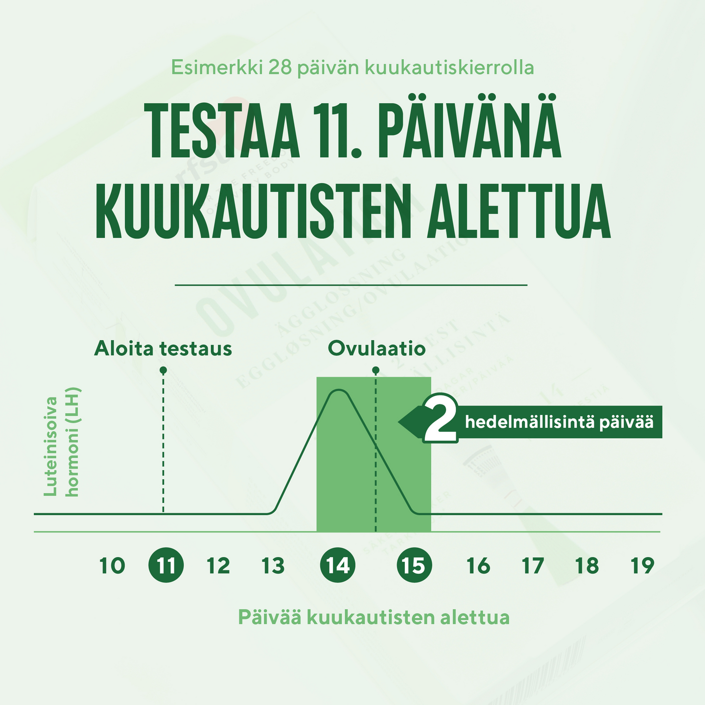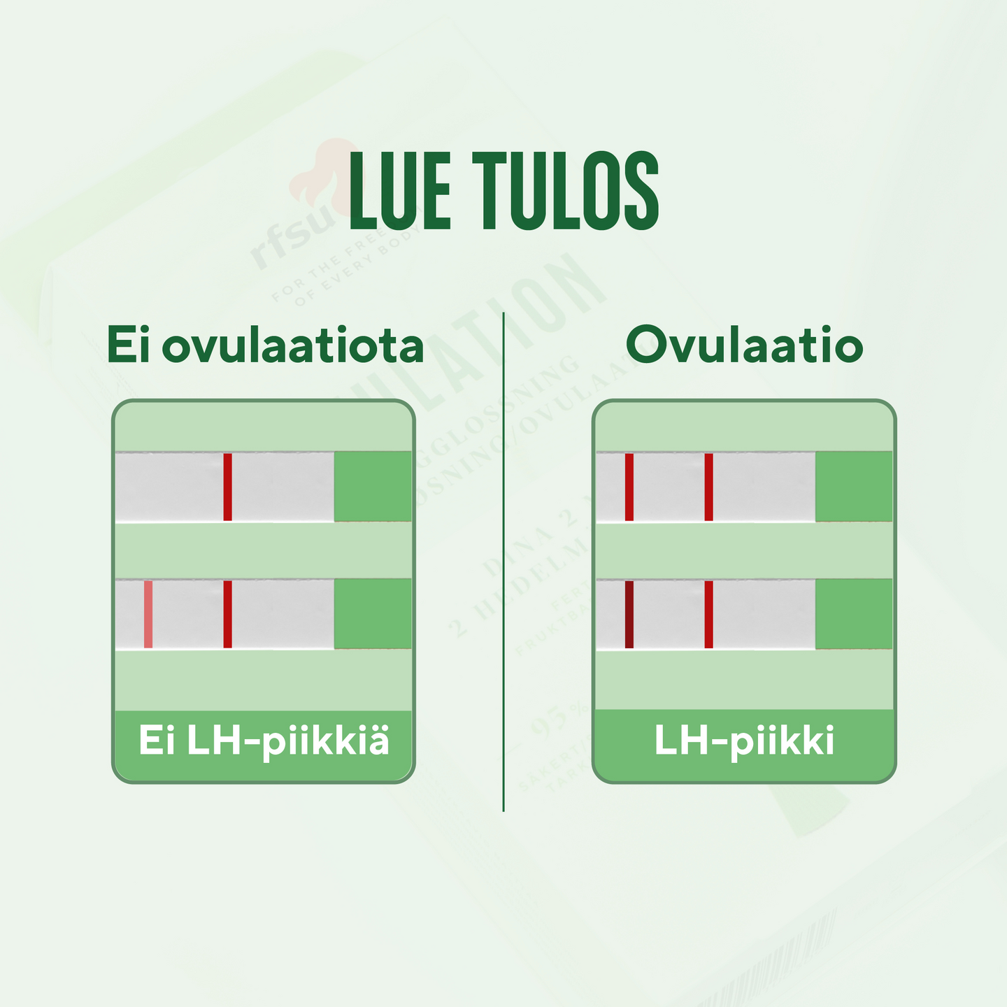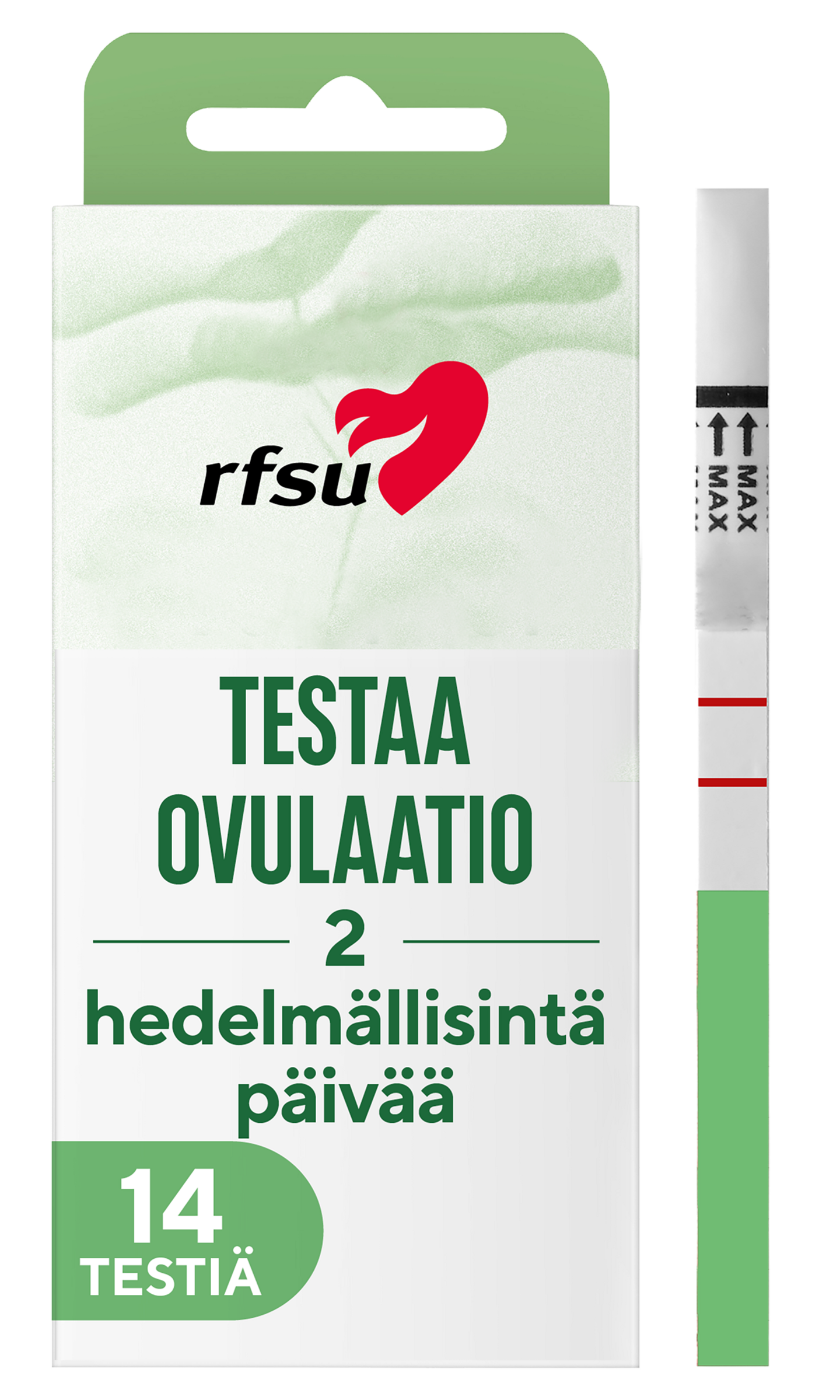 RFSU Ovulation -testin avulla voit nopeasti ja helposti selvittää, milloin sinulla on ovulaatio ja parhaat mahdollisuudet tulla raskaaksi. Testi seuraa luteinisoivan hormonin (LH) pitoisuuden nousua virtsassa yli 25 mlU/ml ja näyttää kaksi hedelmällisintä päivääsi. Hedelmällisillä naisilla ovulaatio tapahtuu suunnilleen kunkin kuukautiskierron puolivälissä, 12-16 päivää ennen kuukautisia. Normaalisti luteinisoivan hormonin (LH) taso nousee voimakkaasti ennen ovulaatiota. LH:n nousu tapahtuu noin 24-48 tuntia ennen ovulaatiota eli munasolun irtoamista munasarjasta. LH:n nousun aikana olet hedelmällisimmilläsi seuraavat kaksi päivää. Jos olet yhdynnässä näiden 48 tunnin aikana, mahdollisuutesi tulla raskaaksi lisääntyy. Koska siittiöt voivat säilyä elossa useita päiviä, on mahdollista tulla raskaaksi yhdynnässä myös ennen kuin LH:n nousu on havaittu.