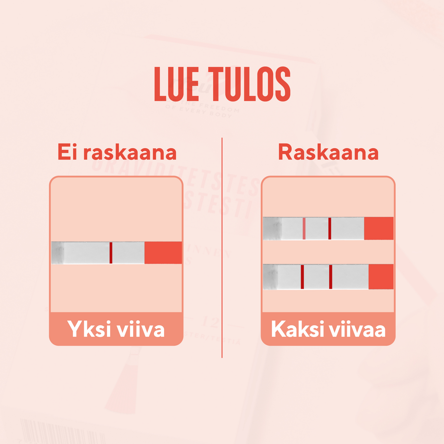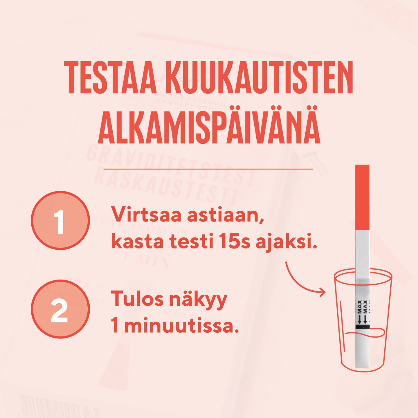 RFSU Raskaustestin avulla voit nopeasti ja helposti selvittää, oletko raskaana. Tulos ilmestyy 1 minuutissa, ja testin voi tehdä sinä päivänä, kun kuukautisten olisi pitänyt alkaa. Testin herkkyys on 25 mlU/ml hCG-hormonia virtsassa. Helppokäyttöiset testiliuskat, jotka kastetaan virtsaa sisältävään astiaan. Näyttää tulokset selkeästi yhdellä tai kahdella viivalla. Testi on yli 99 % luotettava siitä päivästä alkaen, jolloin kuukautisten olisi pitänyt alkaa. Voit testata mihin vuorokaudenaikaan tahansa, mutta turvallisinta on mitata aamuvirtsasta, jolloin hCG-pitoisuus on korkeimmillaan. RFSU Raskaustesti on samaa testityyppiä, jota kätilöt ja gynekologit käyttävät. Pakkaus sisältää 2 testiliuskaa. Lue ohjeet ennen käyttöä.