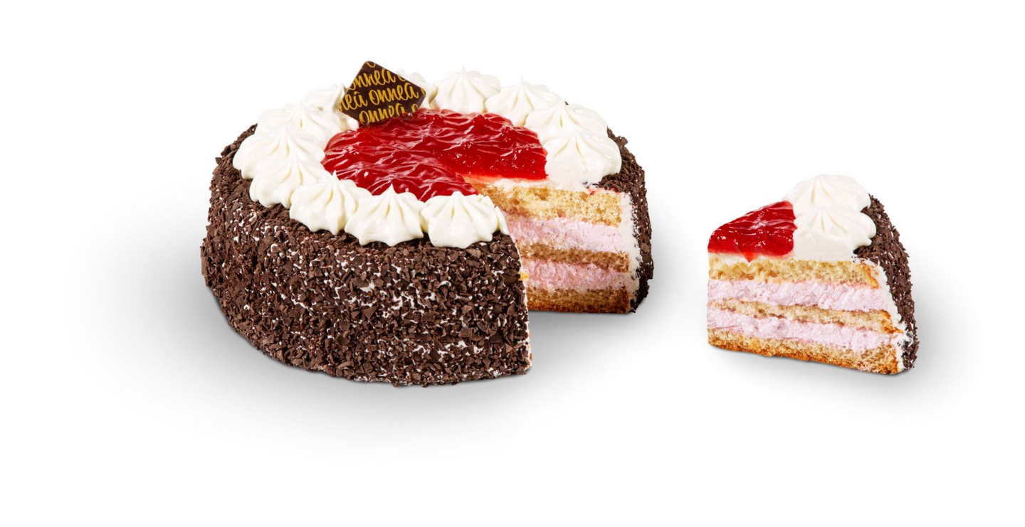 Perinteinen vadelmamoussetäytteinen äitienpäiväkakku on koristeltu vadelmakiilteellä ja suklaarouheella. Laktoositon.