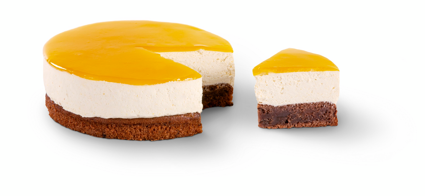 Suklaakakkupohjan päällä raikas mangojuustotäyte ja mangokiille.
