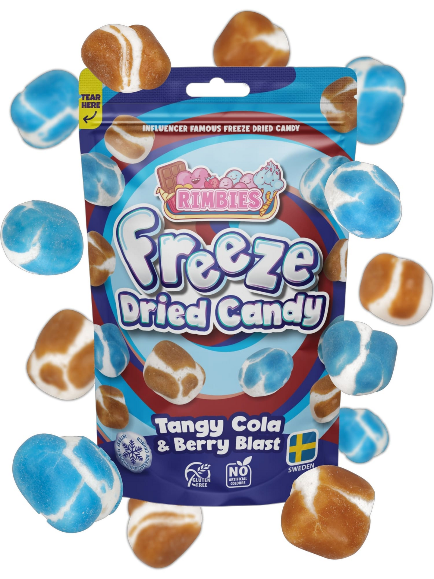Etsitkö jotain uutta ja jännittävää? Tangy Cola & Berry Blast yhdistää nostalgisen kolan maun ja raikkaan marjaisen vivahteen, kaikki rouskuvassa muodossa! Jokainen pala on pakastekuivattu kevyeksi ja ilmavaksi, ja parasta on, että jokaisen haukun sisältä paljastuu hapan/kupliva jauhesydän, joka tuo lisää yllätyksellisyyttä. Karkin sulaessa hapan jauhe vapautuu, antaen makuhermoillesi pirteän kola-marjaisen twistin, jota et unohda.