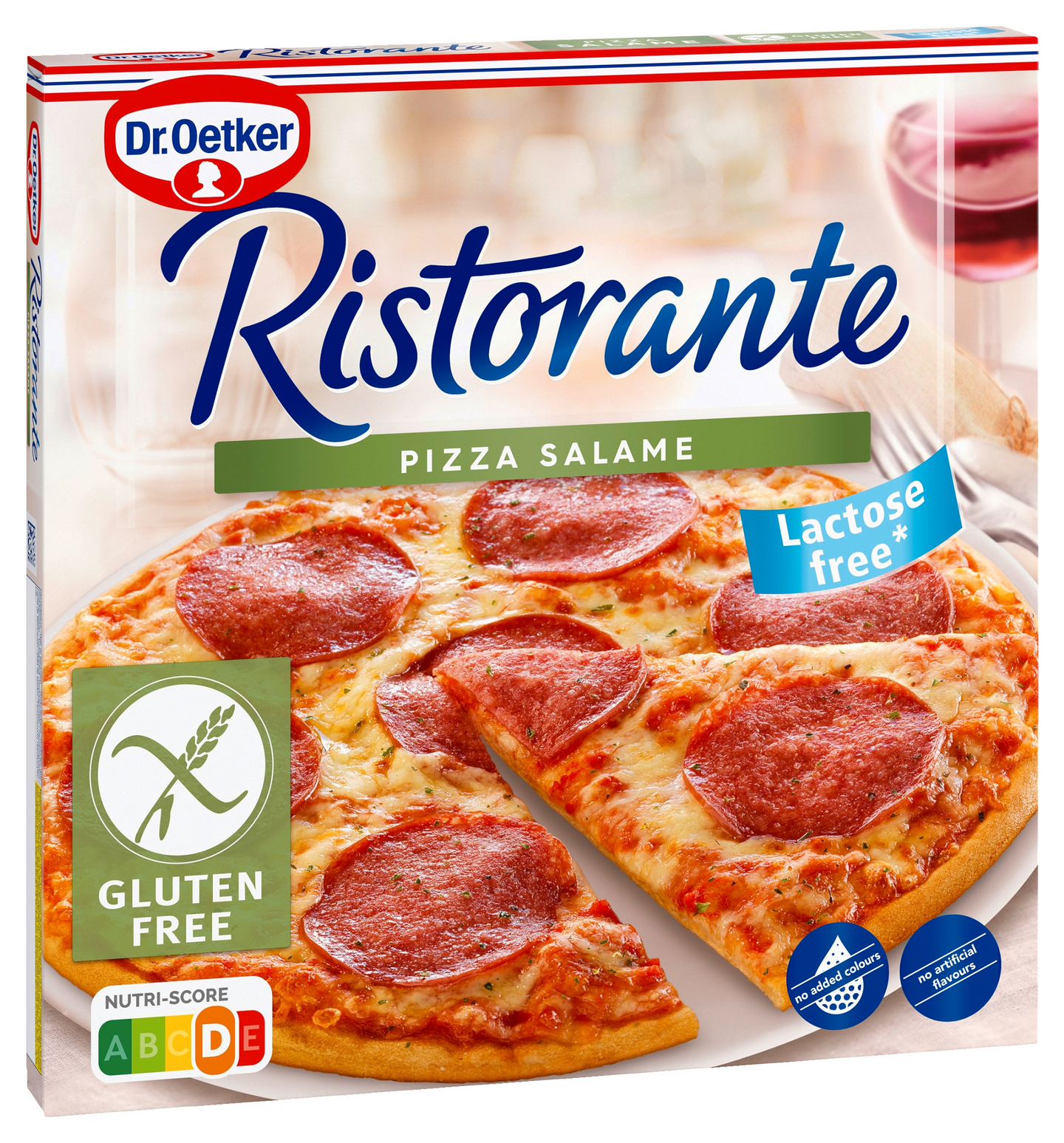Ristorante Salame Gluteenittoman pizzan täytteenä on maukasta tomaattikastiketta sekä runsaasti tomaattia, mozzarella- ja edamjuustoa sekä mausteista salamia. Riisistä ja perunasta tehty rapeaksi paistuva pizzapohja on luontaisesti gluteeniton.