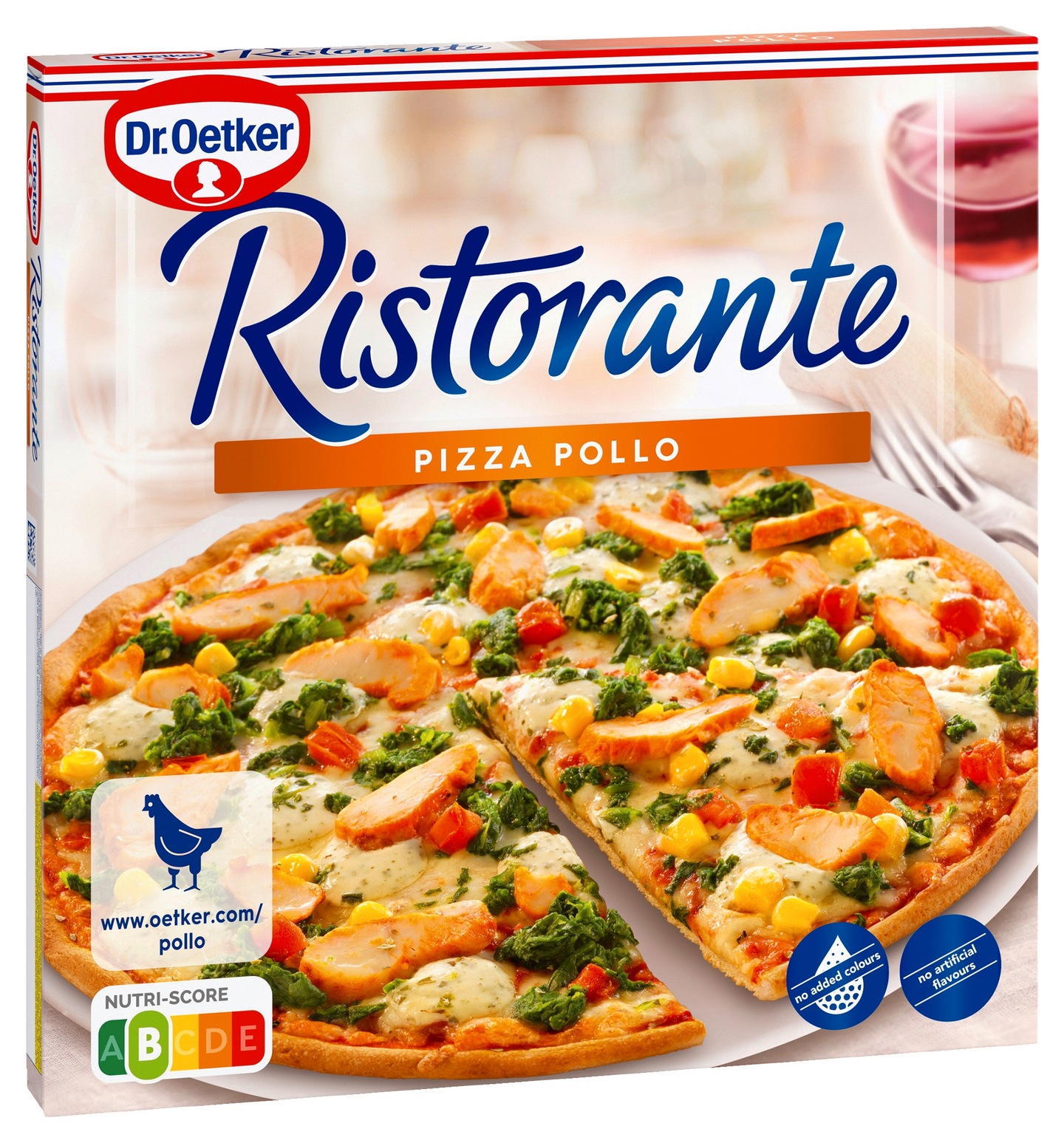 Ristorante Pollo pizza, jossa on täytteenä reilusti tomaattia, juustoa ja kananrintaa rapean ohuella pohjalla, pakaste.