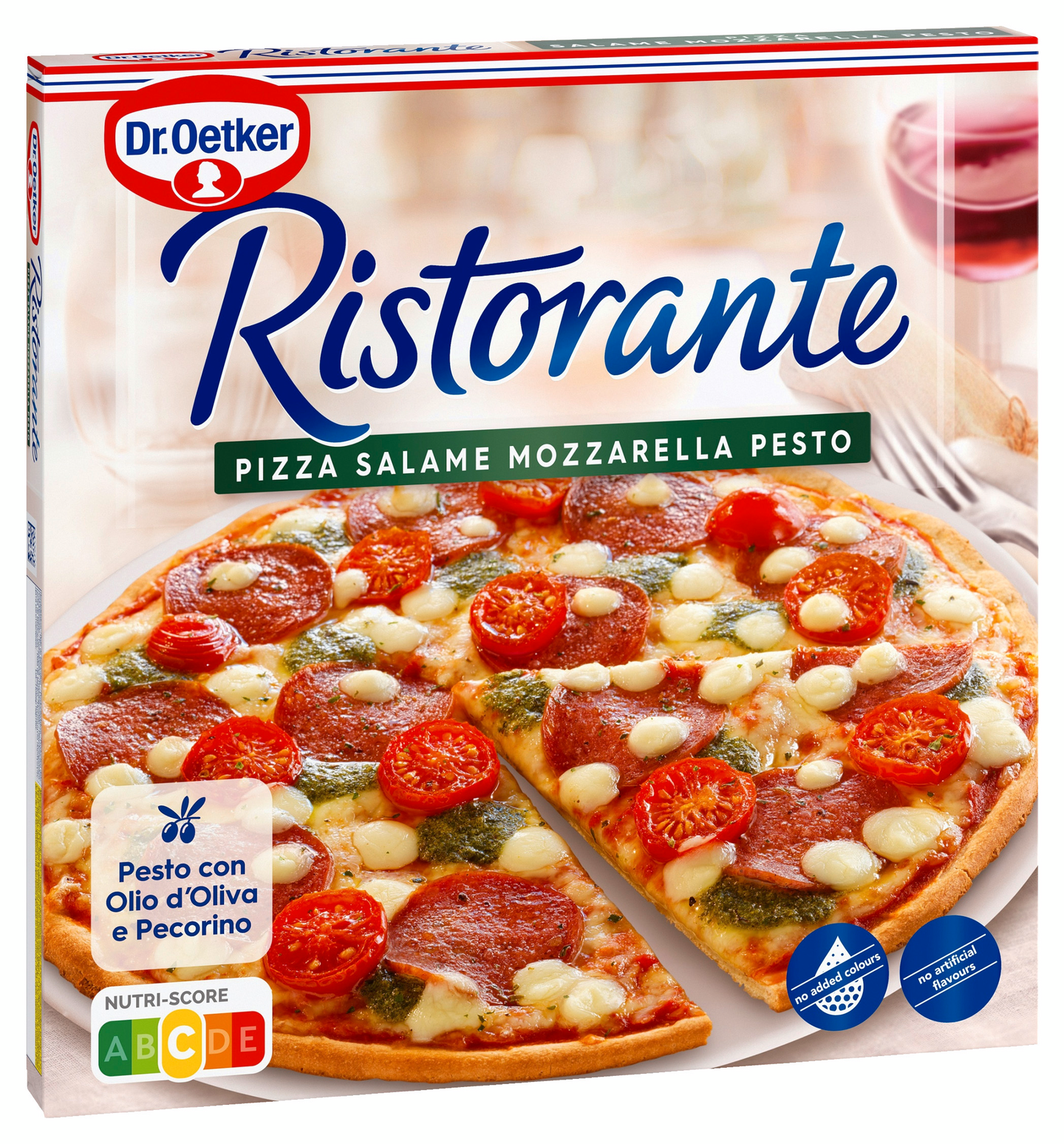 Ristorante Salame Mozzarella Pesto pizza, jossa on täytteenä reilusti tomaattia, salamia, mozzarellaa ja 5,4% yrttipestoa rapean ohuella pohjalla, pakaste.