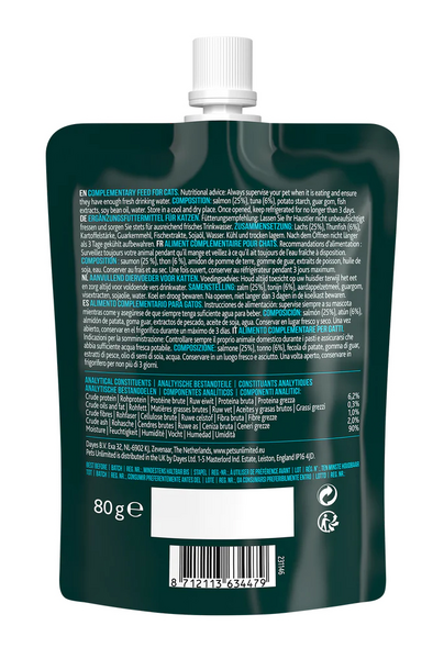 Nirsoja tai vain erittäin älykkäitä, kissat tietävät tarkalleen mitä haluavat, ja se on Pets Unlimitedin herkkutahna! Ne syövät sitä kirjaimellisesti kädestäsi, koska kissat eivät voi vastustaa suurta lohen määrää ja sen herkullista makua. Se on täydellinen päivittäinen välipala, koska se sisältää vähän rasvaa, eikä sisällä lisättyä sokeria tai suolaa eikä keinotekoisia väri-, maku- tai tuoksuaineita. Ei mitään turhaa! Käytä tahnaa aterian kruununa, lääkkeiden piilottamiseen tai yksinkertaisesti herkullisena välipalana. Kätevän korkin ansiosta voit helposti annostella välipalan pienempiin annoksiin. - Korkea kala-/lihapitoisuus - Vähärasvaisuus - Ei lisättyä sokeria tai suolaa - Ei keinotekoisia värejä, aromeja tai makuaineita - Hyvä apu nesteytykseen - Maukas välipala - Helppo annostella pienemmissä annoksissa kätevän korkin ansiosta - Sopii lääkkeiden piilottamiseen tai yksinkertaisesti lisäherkkuna - Edistää vuorovaikutusta sinun ja kissasi välillä Sisältö: 80g per pussi