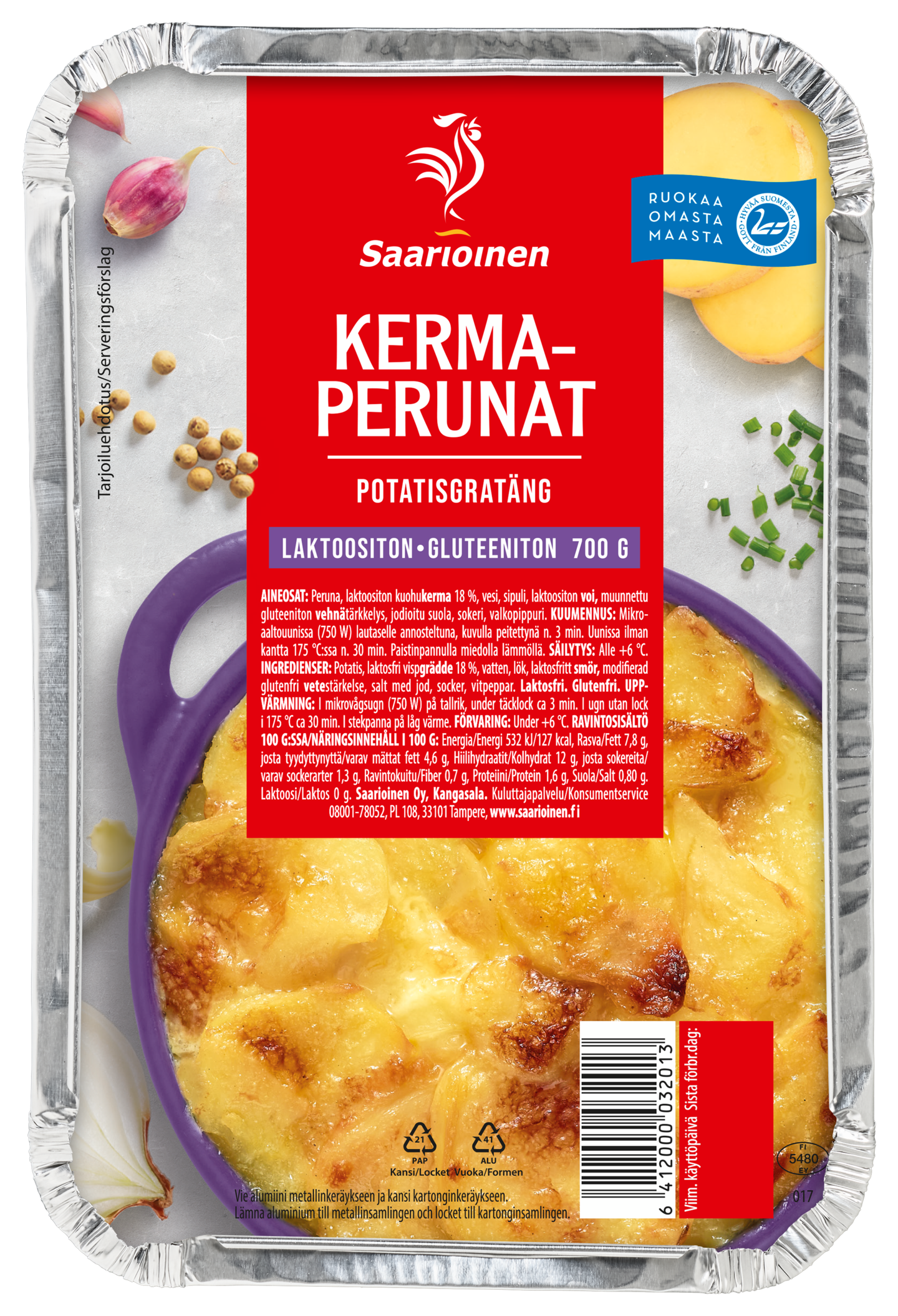 Paistoimme kuumassa uunissa tuoreista perunoista ja kermaisesta kastikkeesta täyteläisen ja maukkaan perunalisäkkeen. Nämä kermaperunat sulavat suussa ja ne voi vaivatta lämmittää vuoassa uunissa tai vaikkapa grillissä. Saarioinen on Suomen luotetuin valmisruokamerkki.
