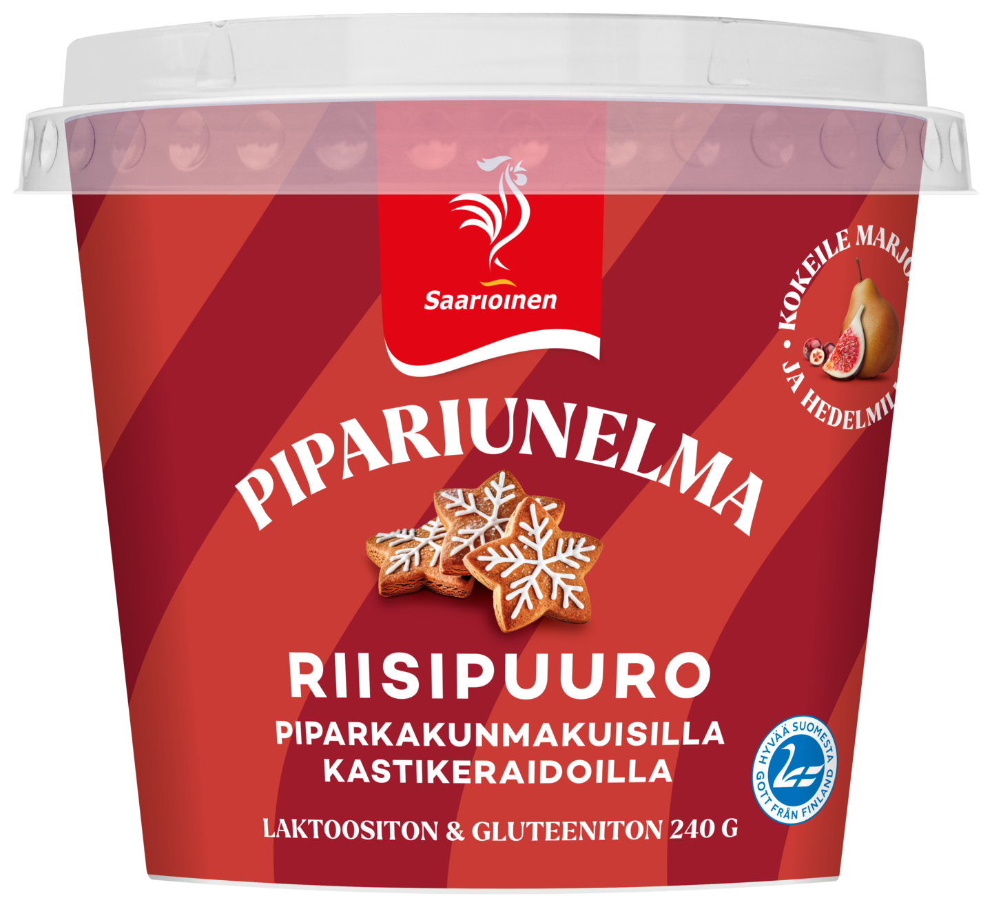 Pipariunelma on jokaisen nautiskelijan unelma. Se on ihanan täyteläinen ja pehmeä riisipuuro, jonka täydensimme herkullisilla piparikastikeraidoilla. Samettisessa piparikastikkeessa maistuu aidot piparkakun maut: kaneli, neilikka ja inkivääri. Nauti Pipariunelma, kun kaipaat herkutteluhetkeä. Moni hyvä asia alkaa unelmasta – nauti omasta herkkuhetkestäsi. Saarioinen on Suomen luotetuin valmisruokamerkki.