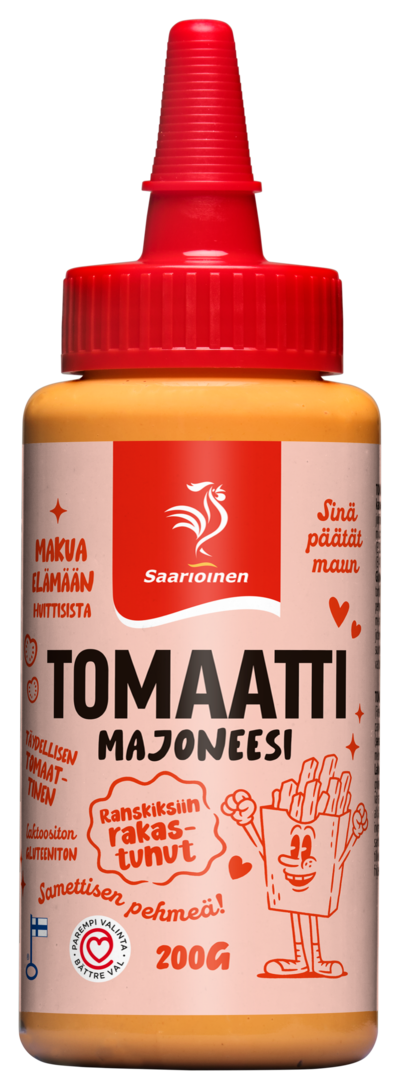 Ranskalaiset, hodarit, burgerit, kasvistikut ja tortillat sekä muut grilliherkut - kaikkiin näihin sopii samettisen pehmeä ja täydellisen tomaattinen majoneesimme. Majoneesimme on valmistettu Huittisissa, aidoista laadukkaista raaka-aineista, joten voit varmasti luottaa tuotteiden laatuun ja tukea samalla suomalaista työtä. Tuotteiden valmistuksessa on huomioitu vastuullisuus, käytämme ainoastaan vapaiden kanojen munia.