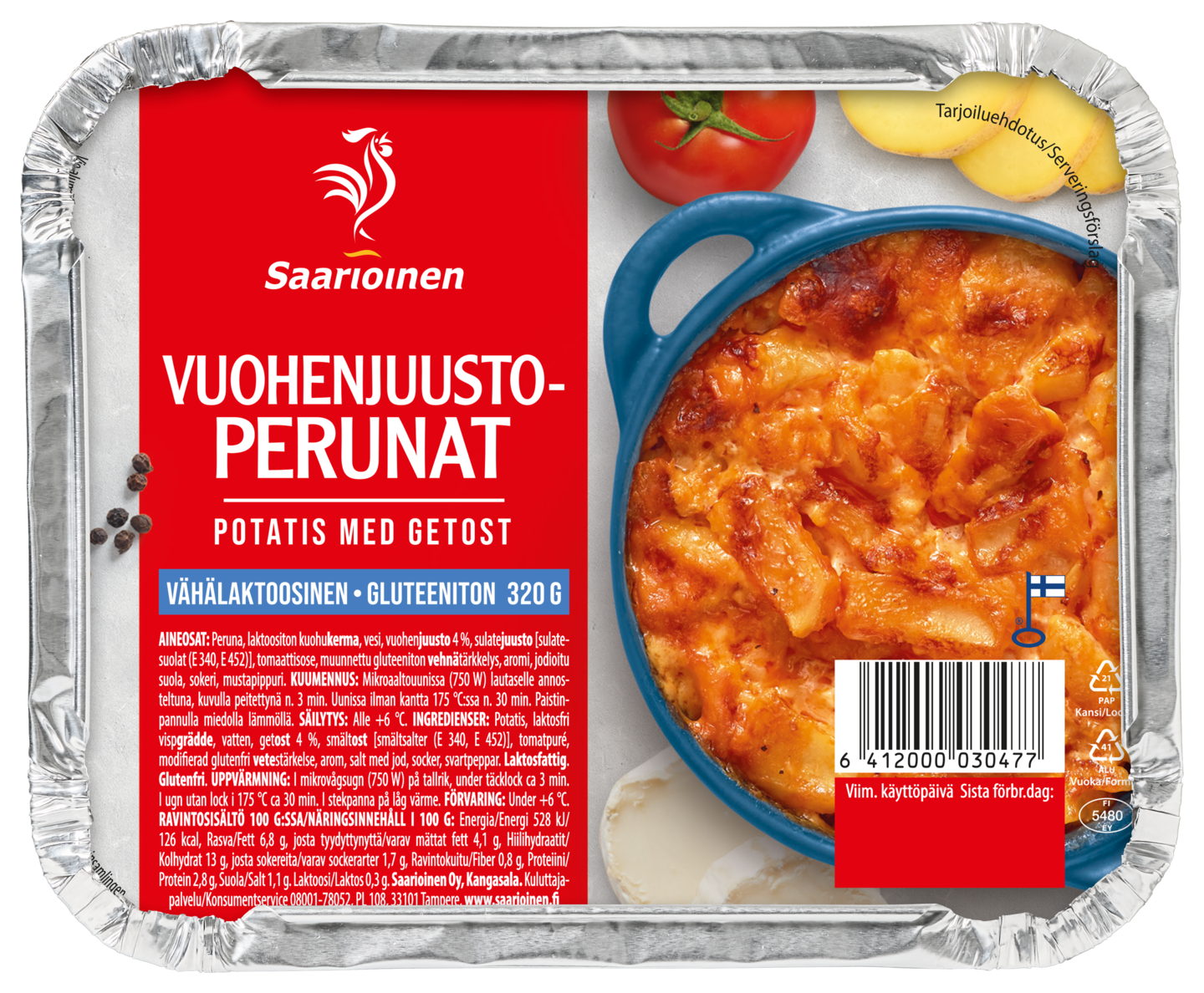 Paistoimme kuumassa uunissa tuoreista perunoista, vuohenjuustosta, tomaatista ja kermaisesta kastikkeesta täyteläisen ja maukkaan perunalisäkkeen. Nämä kermaperunat sulavat suussa ja ne voi vaivatta lämmittää vuoassa uunissa tai vaikkapa grillissä. Saarioinen on Suomen luotetuin valmisruokamerkki.
