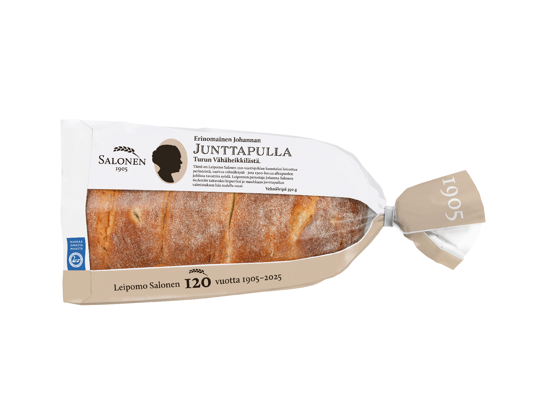 Leipomo Salosen 120-vuotisjuhlan kunniaksi tuomme syksyksi tarjolle perinneleivän, johon vaikutteita on haettu 1900-luvun alkupuolelta. Leipomon perustaja Johanna Salonen tiedettiin taitavaksi leipuriksi ja maukkaan junttapullan valmistuksen hän todella osasi. Junttapulla on pehmeä vehnäleipä, joka sopii hyvin nautittavaksi sellaisenaan tai ruokien lisukkeena.