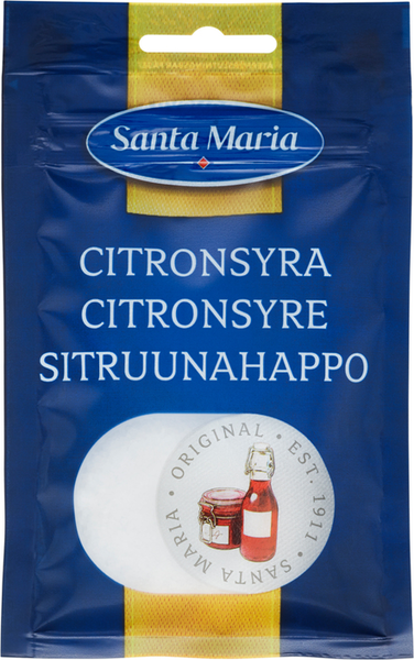 Sitruunahappoa (E330) esiintyy luontaisesti monissa hedelmissä. Mitä enemmän sitruunahappoa, sitä kirpeämpi hedelmä. Sitruunahappoa voidaan käyttää marmeladissa ja mehussa kirpeämmän lopputuloksen aikaansaamiseksi. Sillä on myös säilyttävä vaikutus: sitruunahappoa käytetään lisäämään säilykkeiden happamuutta ja parantamaan niiden säilyvyyttä. Käytä Santa Maria sitruunahappoa reseptin ohjeiden mukaan. * Sitruunahappo säilytetään kuivassa paikassa
