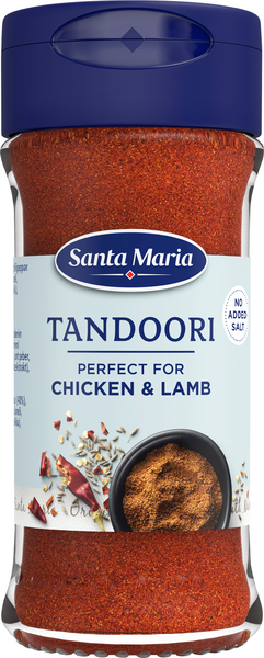 Intialainen Tandoori on mieto ja aromikas mausteseos, jonka on saanut inspiraationsa intialaisesta tandoori-perinteestä. Tässä tandoori-mausteessa on värikäs ja hieman hapan seos chilipippuria, valkosipulia, juustokuminaa ja inkivääriä. Santa Maria Indian Tandoori on täydellinen uunkanalle tai lammaspadalle. Vegaaniset ja kasvismuhennokset sekä lämpimät ja kylmät kastikkeet saavat myös mukavan värin ja maukkaan tandoorin maun. • Säilytä kuivassa ja pimeässä aromin säilyttämiseksi pidempään