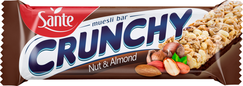 Sante Chrunchy välipalapatukka pähkinöillä ja manteleilla on suklaalla päällystetty rapea patukka pikkunälkään tai herkun tilalle. Kaurahiutalepohjainen myslipatukka ei sisällä lisättyä vehnää.