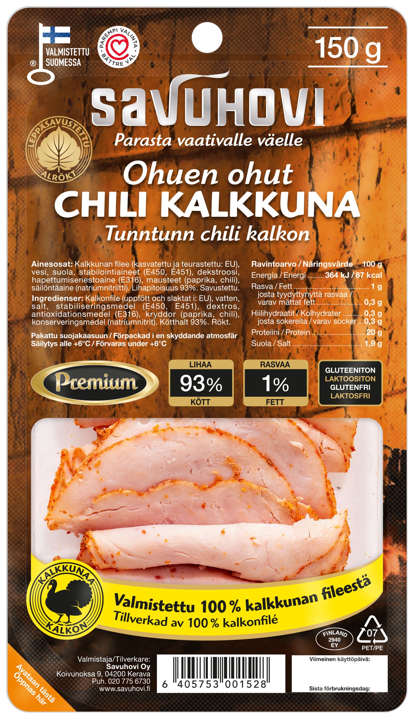 Tämä avainlipulla ja sydänmerkillä varustettu premium-laatuinen kokolihaleikkele on valmistettu 100% kalkkunan fileestä. Mausteena käytetty chili tuo hieman tulisuutta leikkeleisiin. Extra ohuet viipaleet sopivat leivän päälle tai täytteeksi suolaisiin leivonnaisiin.
