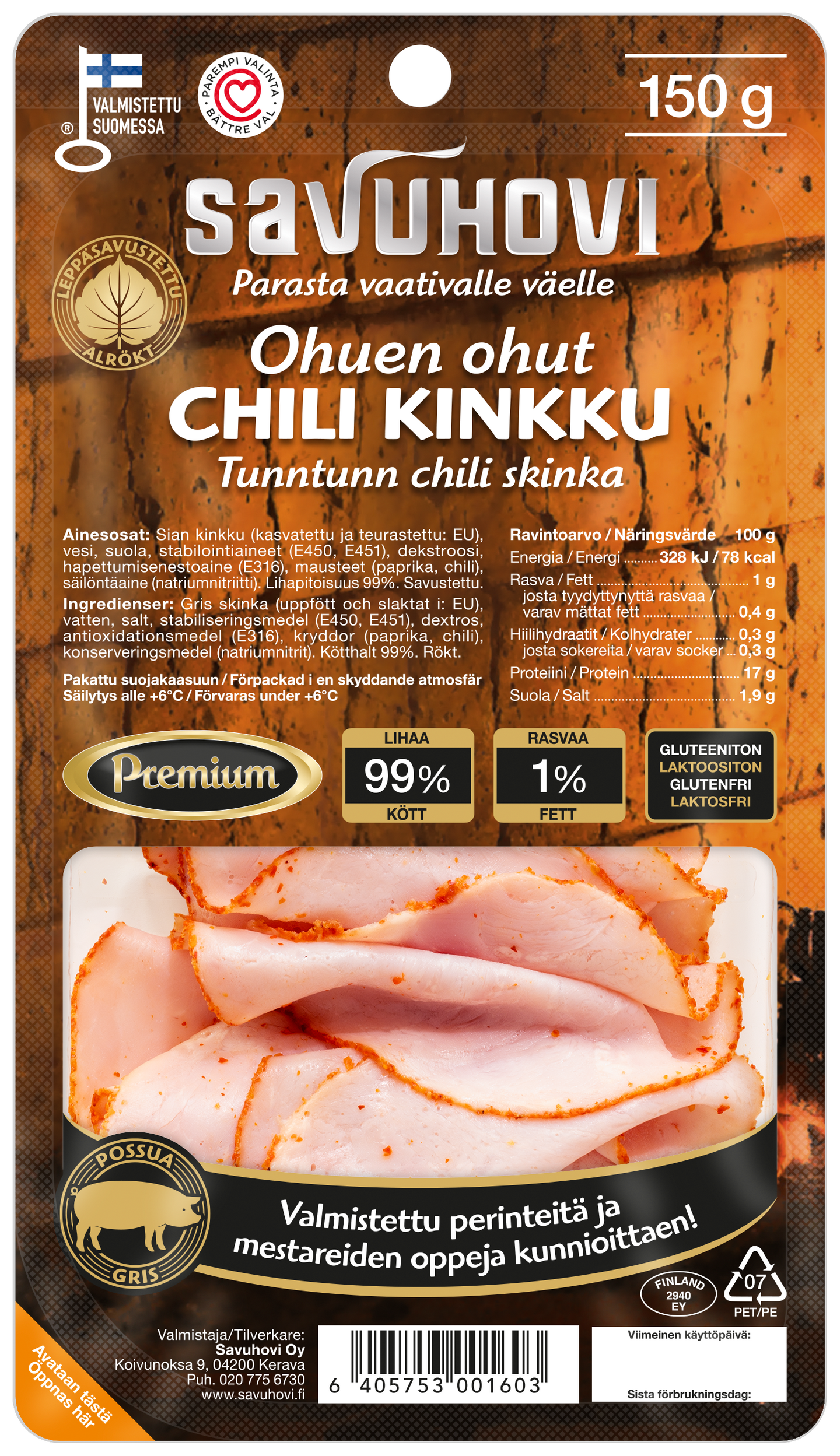 Tämä avainlipulla ja sydänmerkillä varustettu premium-laatuinen kokolihaleikkele sisältää jopa 99% lihaa. Mausteena käytetty chili tuo hieman tulisuutta leikkeleisiin. Extra ohuet viipaleet sopivat leivän päälle tai täytteeksi suolaisiin leivonnaisiin.