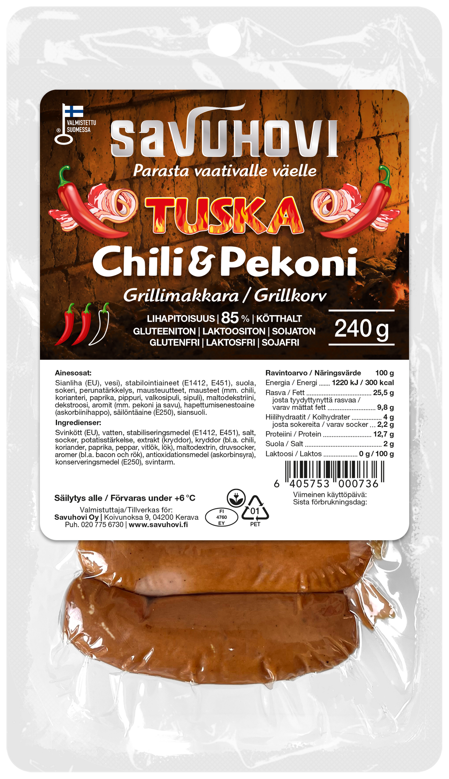 Suomessa valmistettu Tuska chili & pekoni makkara on täydellinen valinta tulisen ruoan ystäville. Sopivasti lisäpotkua tuova chili sekä pekonin suolainen ja savuinen aromi muodostavat täydellisen makuparin tässä ruokaisassa grillimakkarassa. Lihapitoisuus 85%, ei sisällä gluteenia tai laktoosia.