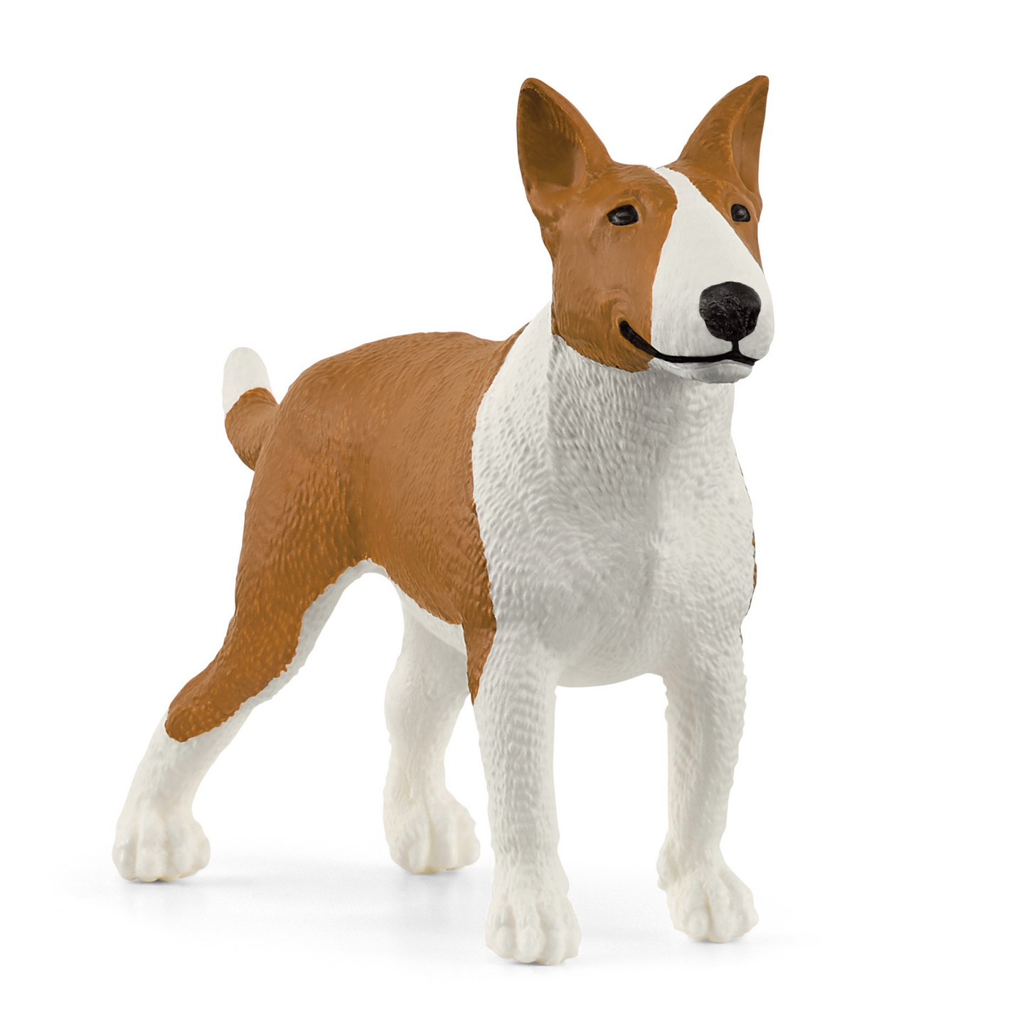 Kuka haukkuu niin innoissaan? Ah, se on tietenkin schleich® FARM WORLDin bullterrierimme. Ihastuttava koira, jolla on pehmoinen nenä ja joka lisäksi pitää erityisen paljon vaaleanpunaisista tyynyliinoista. Brittiläisellä koirarodulla on lyhyt, enimmäkseen takkuinen turkki ja se innostuu... kaikesta! Etenkin leikkimisestä, urheilusta ja hauskanpidosta. Mieluiten bullterrieri telmii uusista terassituoleista rakennetulla esteradalla. Koiran munanmuotoinen pää ja monet lihakset erityisen silmiinpistäviä. Vahvojen takajalkojensa ansiosta se voi esimerkiksi työntää asioita uskomattoman hyvin ja helposti: Se on kerran onnistunut jopa työntämään jumiin jääneen auton pois peittosuosta.