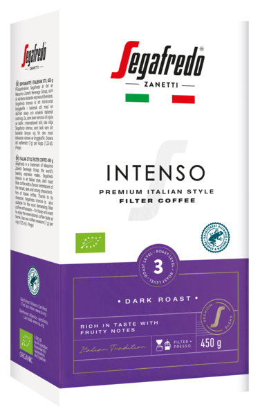 Segafredo Intenso on italialaistyyppinen premium-suodatinkahvi, jonka maku on intensiivinen ja mustaherukkainen. Sen monivivahteisen maun kruunaavat luomupavut Ugandan Sipi Fallsilta, Hondurasista ja Vietnamista. Kahvi on RAC-sertifioitu ja sen paahtoaste on 3. Laadukkaat Segafredo-suodatinkahvit ovat vastuullisuussertifioituja ja vastaavat tämän päivän kahvikuluttajan makutoiveisiin. Segafredo-suodatinkahvit pakataan nyt ympäristöystävällisempään pakkaukseen. Pakkausmateriaalia on vähennetty 30 %.