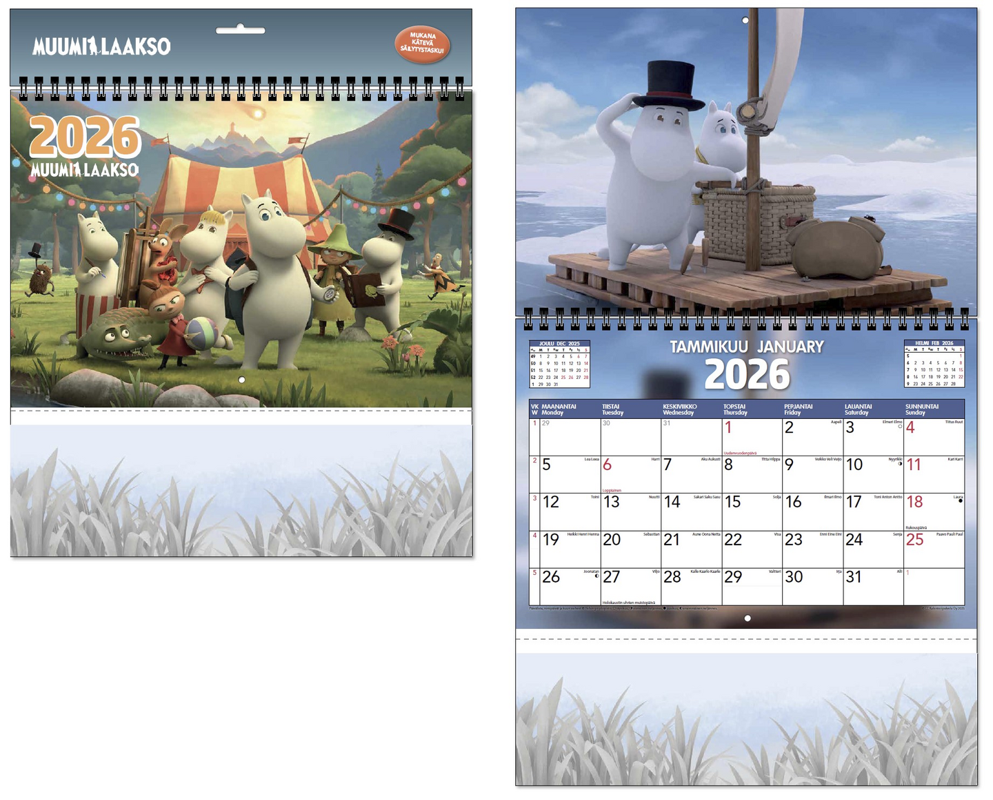 Muumilaakso-sarjan upeasta kuva-aineistosta koottu seinäkalenteri vuodelle 2026. Kalenterissa 12 kuvaa Muumilaakso TV-sarjasta, 4. tuotantokaudelta. Viikonpäivät ja kuukaudet suomeksi ja englanniksi. Suomalaiset nimipäivät. Sisältää kätevän säilytystaskun, ja ripustuspahvin. Koko avattuna 40x30 cm. Valmistettu FSC-sertifioidusta paperista.