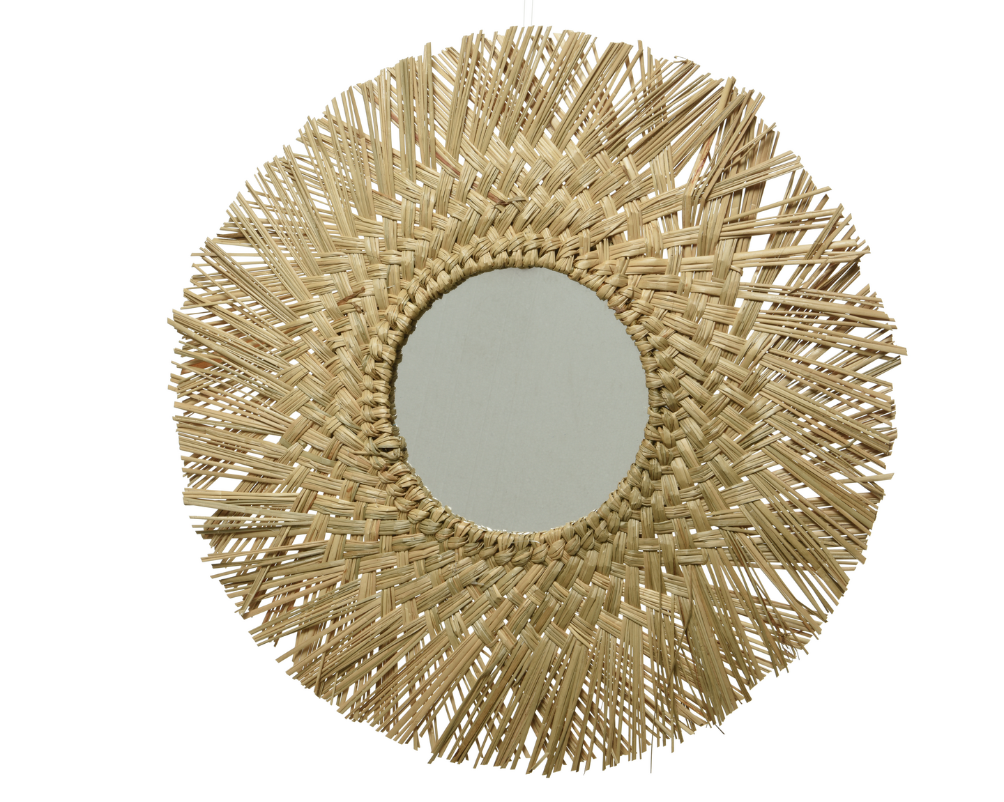 Ihastuttava pyöreä peili luo bohotyylin helposti. Peilin halkaisija näyttävällä, punotulla meriheinäkehyksellä on 80 cm.