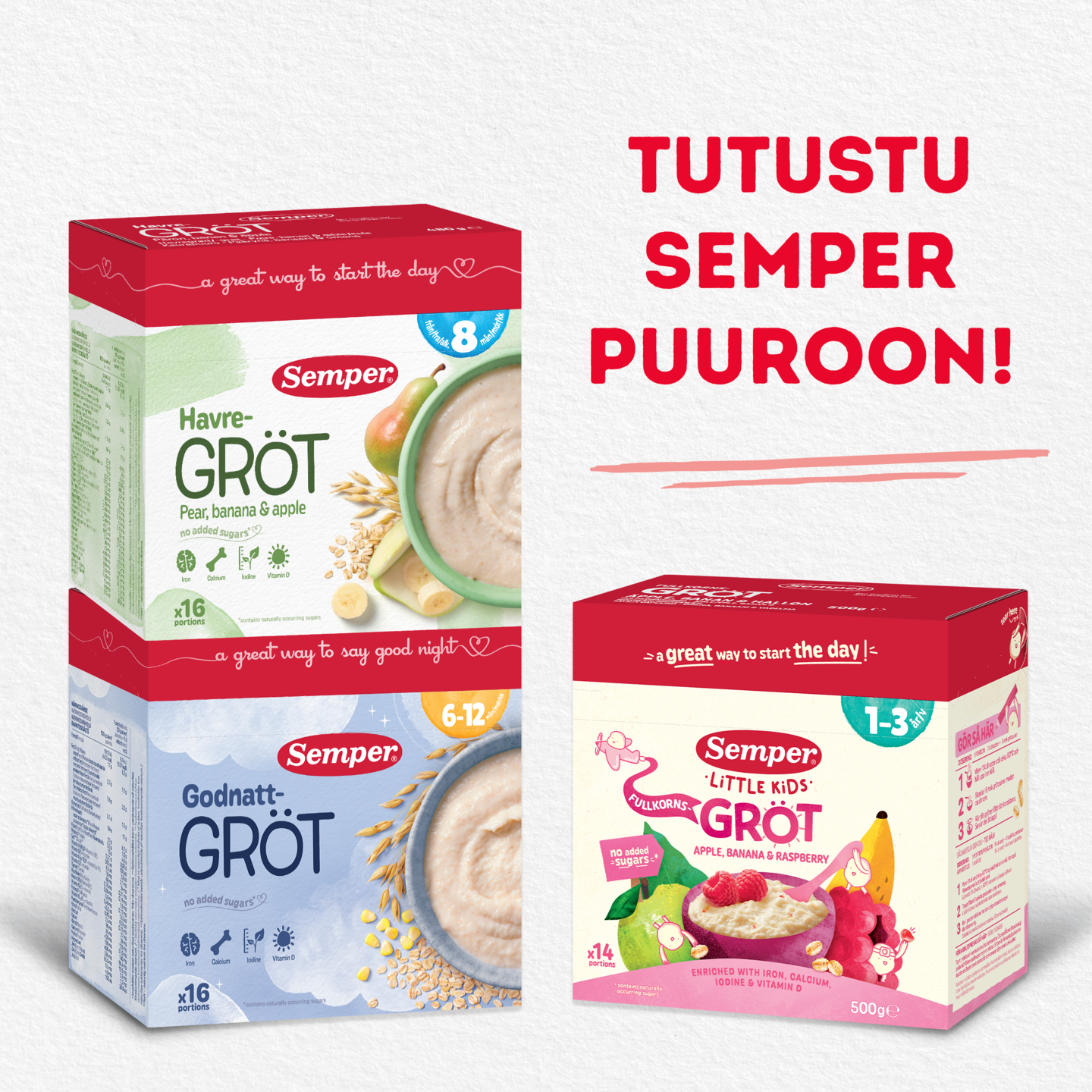 Hyvää yötä -puurossa on mieto maidon ja kauran maku, minkä vuoksi puurosta tulee helposti lapsesi uusi suosikki. Täysjyväkaurasta saa niin liukoisia ja liukenemattomia kuituja. Puuro sopii 6-12kk ikäisille lapsille. Hyvää yötä -puuro on sopiva iltapuuroksi, nukkumaan mentäessä, mutta sitä tarjota myös mihin aikaan päivästä tahansa, koska se on ravitsemuksellisesti täysipainoista! Semper puuroa on myös helppo valmistaa kotona tai matkoilla, sekoita vain jauhe veteen. Kaikki Semper puurot on täydennetty raudalla, jodilla, kalsiumilla ja D-vitamiinilla.