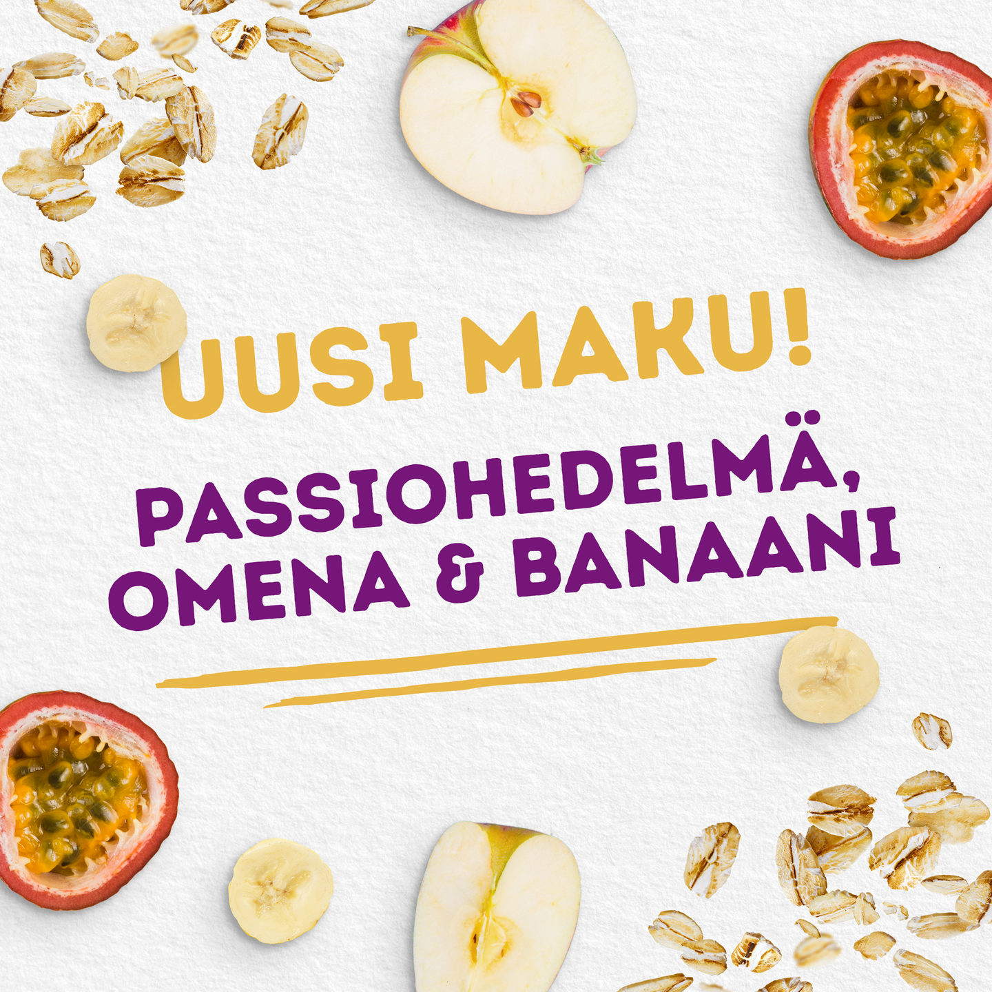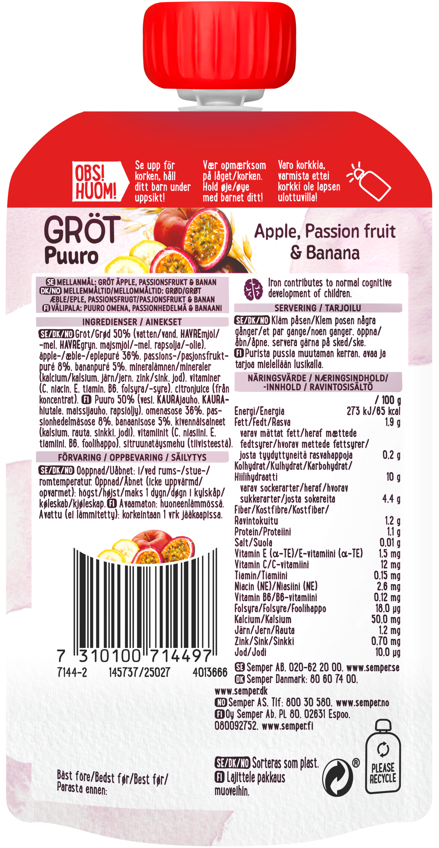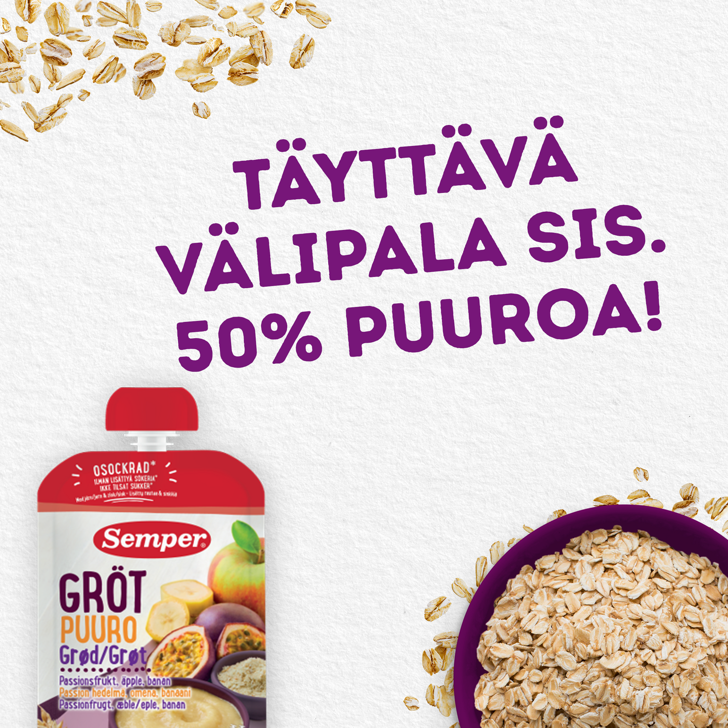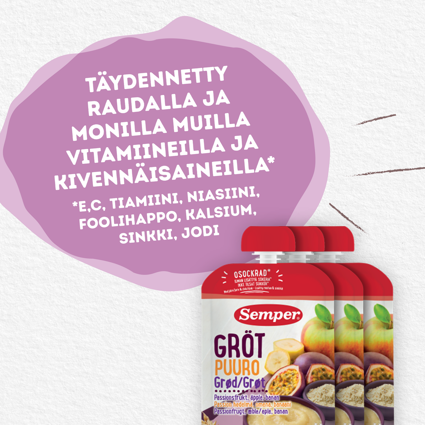 Semperin passionhedelmää, omenaa ja banaania sisältävä valmispuuro on täyttävä ja herkullinen välipala lapselle. Siinä on vähintään 50 % puuroa, ja sitä on täydennetty raudalla, kalsiumilla ja C-vitamiinilla. Puuro sopii lapsille 6 kuukauden iästä alkaen. Ei lisättyä sokeria tai makeita mehutiivisteitä, sisältää vain hedelmien luontaisen sokerin. Puuroon on lisätty lapselle tärkeitä vitamiineja ja kivennäisaineita, kuten rautaa ja sinkkiä. Puuropussi on hyvä eväs retkelle tai kotona nautittavaksi. Kätevä pussukka, josta lapsi voi syödä suoraan tai josta voi helposti annostella lusikkaan. Puuro säilyy avaamattomana huoneenlämmössä. Tarjoa sellaisenaan huoneenlämpöisenä tai lautasella lämmitettynä. Kaikki Semper lastenruoka valmistetaan lastenruokalainsäädännön asettamien vaatimusten mukaisesti ilman väri-, säilöntä- tai makeutusaineita.