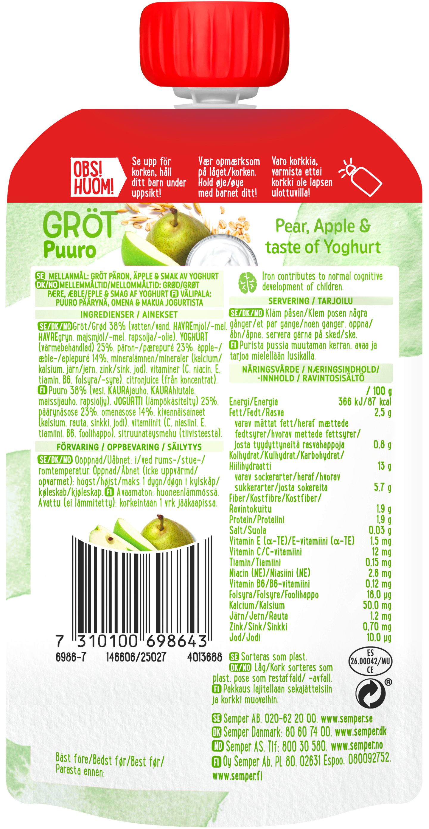 Semperin jogurttia, omenaa ja päärynää sisältävä valmispuuro on herkullinen välipala lapselle. Siinä on vähintään 50 % puuroa, ja sitä on täydennetty raudalla, kalsiumilla ja C-vitamiinilla. Puuro sopii lapsille 6 kuukauden iästä alkaen. Ei lisättyä sokeria tai makeita mehutiivisteitä, sisältää vain hedelmien luontaisen sokerin. Puuroon on lisätty lapselle tärkeitä vitamiineja ja kivennäisaineita, kuten rautaa ja sinkkiä. Puuropussi on hyvä eväs retkelle tai kotona nautittavaksi. Kätevä pussukka, josta lapsi voi syödä suoraan tai josta voi helposti annostella lusikkaan. Puuro säilyy avaamattomana huoneenlämmössä. Tarjoa sellaisenaan huoneenlämpöisenä tai lautasella lämmitettynä. Kaikki Semper lastenruoka valmistetaan lastenruokalainsäädännön asettamien vaatimusten mukaisesti ilman väri-, säilöntä- tai makeutusaineita.