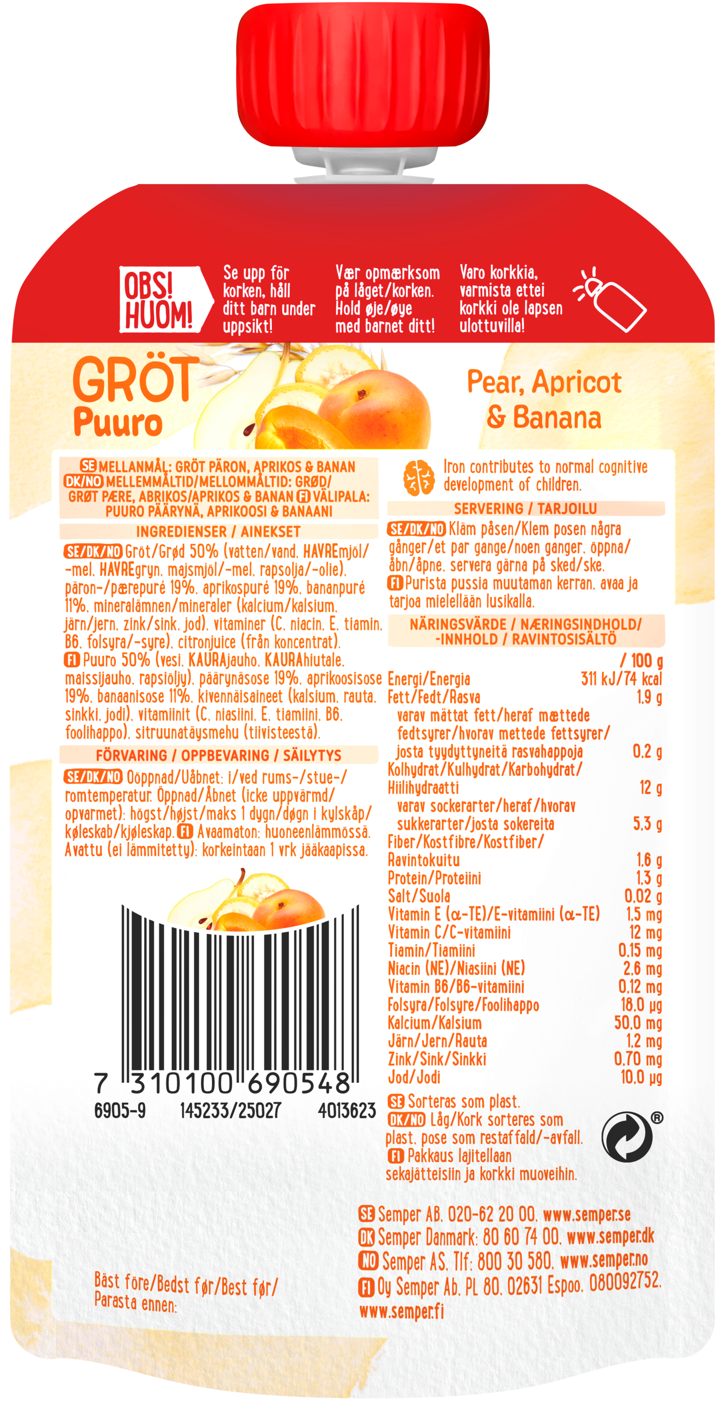 Semperin päärynää, aprikoosia ja banaania sisältävä valmispuuro on täyttävä ja herkullinen välipala lapselle. Siinä on vähintään 50 % puuroa, ja sitä on täydennetty raudalla, kalsiumilla ja C-vitamiinilla. Puuro sopii lapsille 6 kuukauden iästä alkaen. Ei lisättyä sokeria tai makeita mehutiivisteitä, sisältää vain hedelmien luontaisen sokerin. Puuroon on lisätty lapselle tärkeitä vitamiineja ja kivennäisaineita, kuten rautaa ja sinkkiä. Puuropussi on hyvä eväs retkelle tai kotona nautittavaksi. Kätevä pussukka, josta lapsi voi syödä suoraan tai josta voi helposti annostella lusikkaan. Puuro säilyy avaamattomana huoneenlämmössä. Tarjoa sellaisenaan huoneenlämpöisenä tai lautasella lämmitettynä. Kaikki Semper lastenruoka valmistetaan lastenruokalainsäädännön asettamien vaatimusten mukaisesti ilman väri-, säilöntä- tai makeutusaineita.
