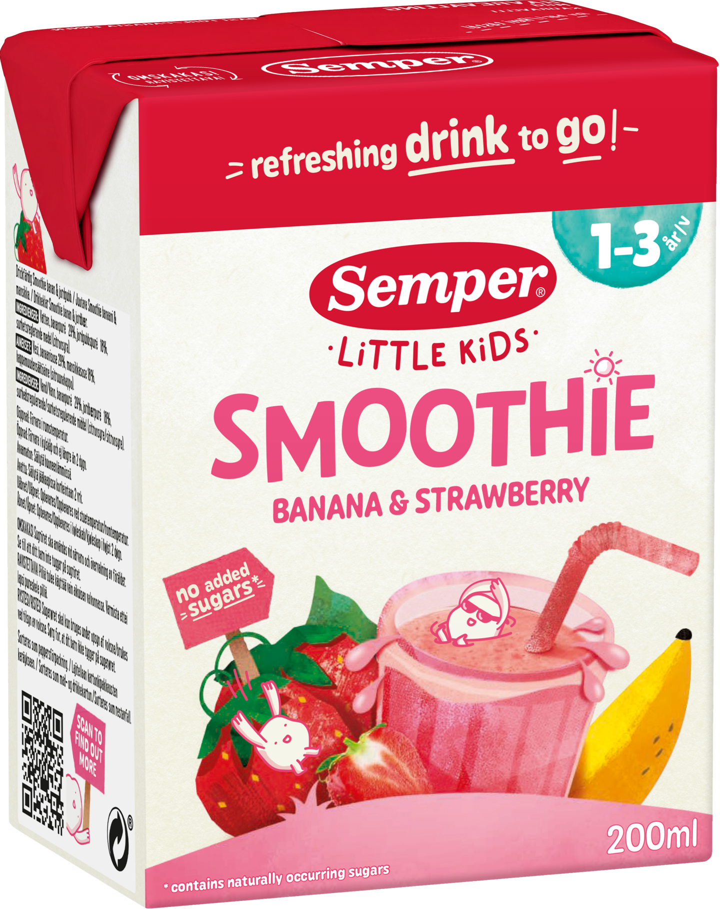 Hedelmäinen juotava lasten välipala ilman lisättyä sokeria! Semper Smoothie on herkullinen banaanista ja mansikasta valmistettu pirtelömäinen juoma. Sokeroimaton, sisältää vain hedelmien luontaisen sokerin. Pakattu tetrapakkaukseen, mukana pilli. Säilyy avaamattomana huoneenlämmössä. Kaikki Semper lastenruoka on valmistettu ilman säilöntäaineita.