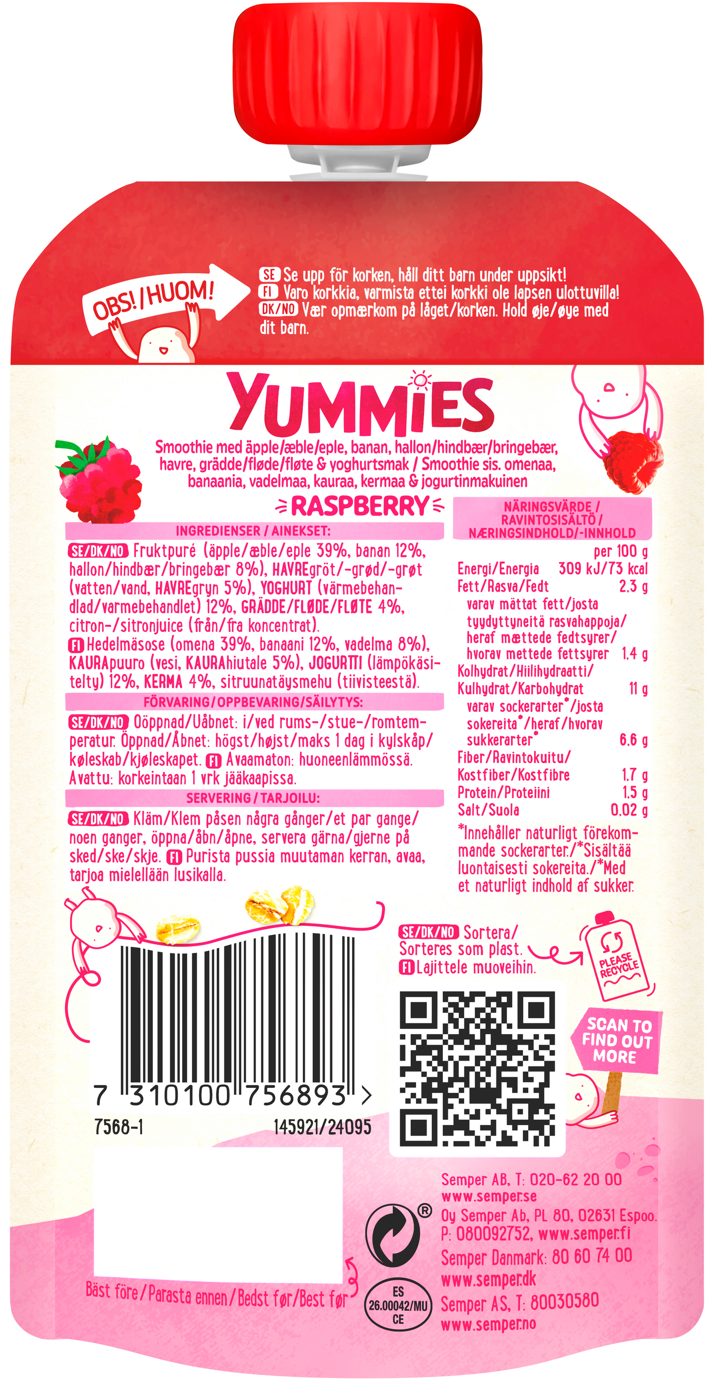 Makua ja kylläisyyttä samasta pussista. Semperin Yummies vadelma smoothie on ihanan herkullinen ja täyttävä välipala 1-3-vuotiaille lapsille. Yummies Vadelma smoothie sisältää hedelmiä ja marjoja, kauraa ja lämpökäsiteltyä jogurttia. Tästä täyttävästä välipalasmoothiesta saa myös proteiniinia ja kuitua.