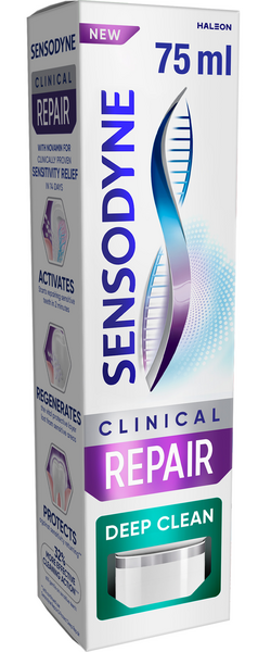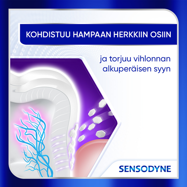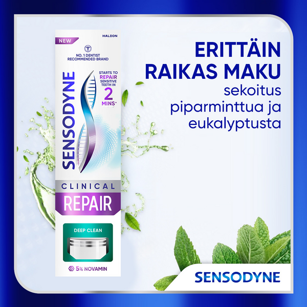 "Päivittäiseen käyttöön tarkoitettu fluorihammastahna vihloville hampaille. Alkaa korjata vihlovia hampaita 2 minuutissa*. Kliinisesti todistettu lievittävän vihlontaa pitkäkestoisesti ja auttavan estämään kivun uusiutumista jatkuvassa käytössä. Hammastahna antaa 32 % tehokkaamman puhdistuksen**, mutta on silti hellävarainen vihloville hampaille. Korjaa ja suojaa aktiivisesti vihlovia hampaita Novamin-teknologian avulla*. Ainutlaatuinen Novamin-teknologia sisältää 96 % samoja ainesosia kuin hammaskiille ja muodostaa vahvan ja suojaavan kerroksen hampaiden pinnalle*. Runsaasti vaahtoutuva. Raikas sekoitus piparminttua ja eukalyptysta. Kierrätettävä tuubi ja korkki. *kliinisesti todistettu lievitys vihlontaan 14 päivässä ** vs Sensodyne Repair & Protect Deep Repair"""
