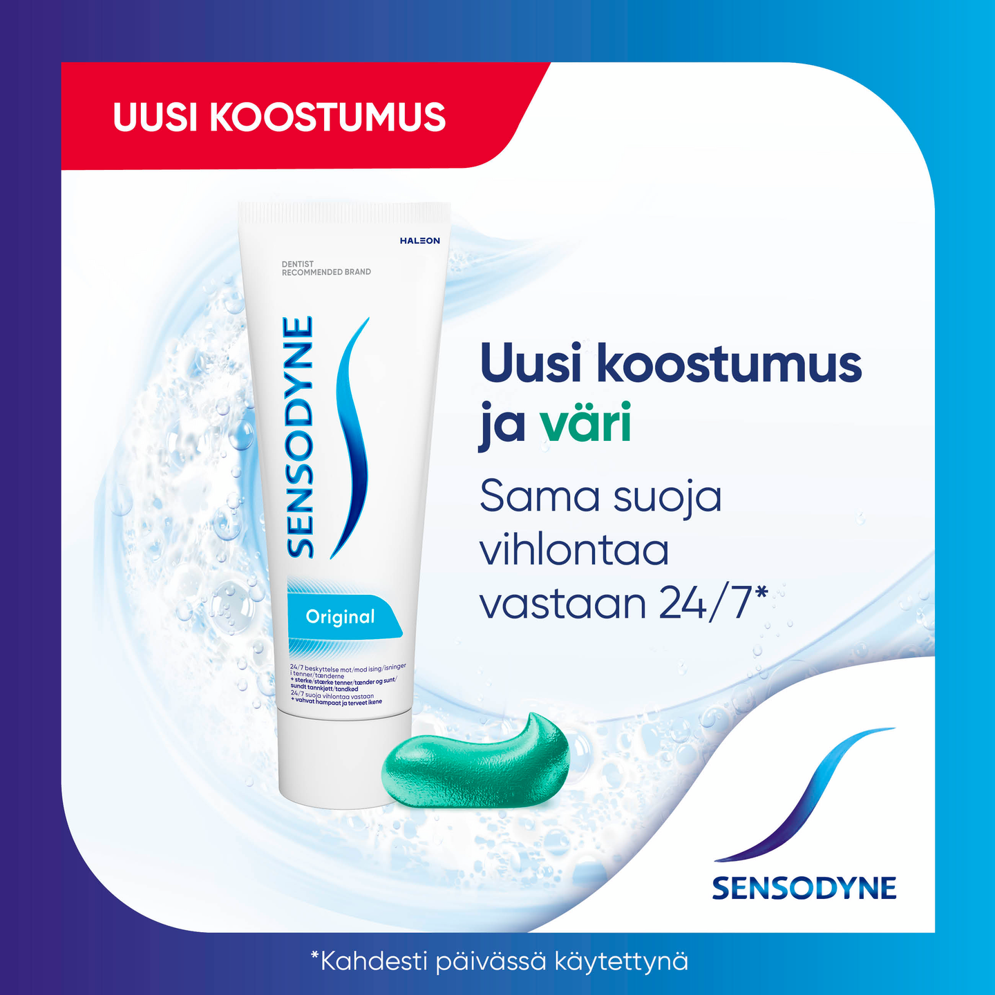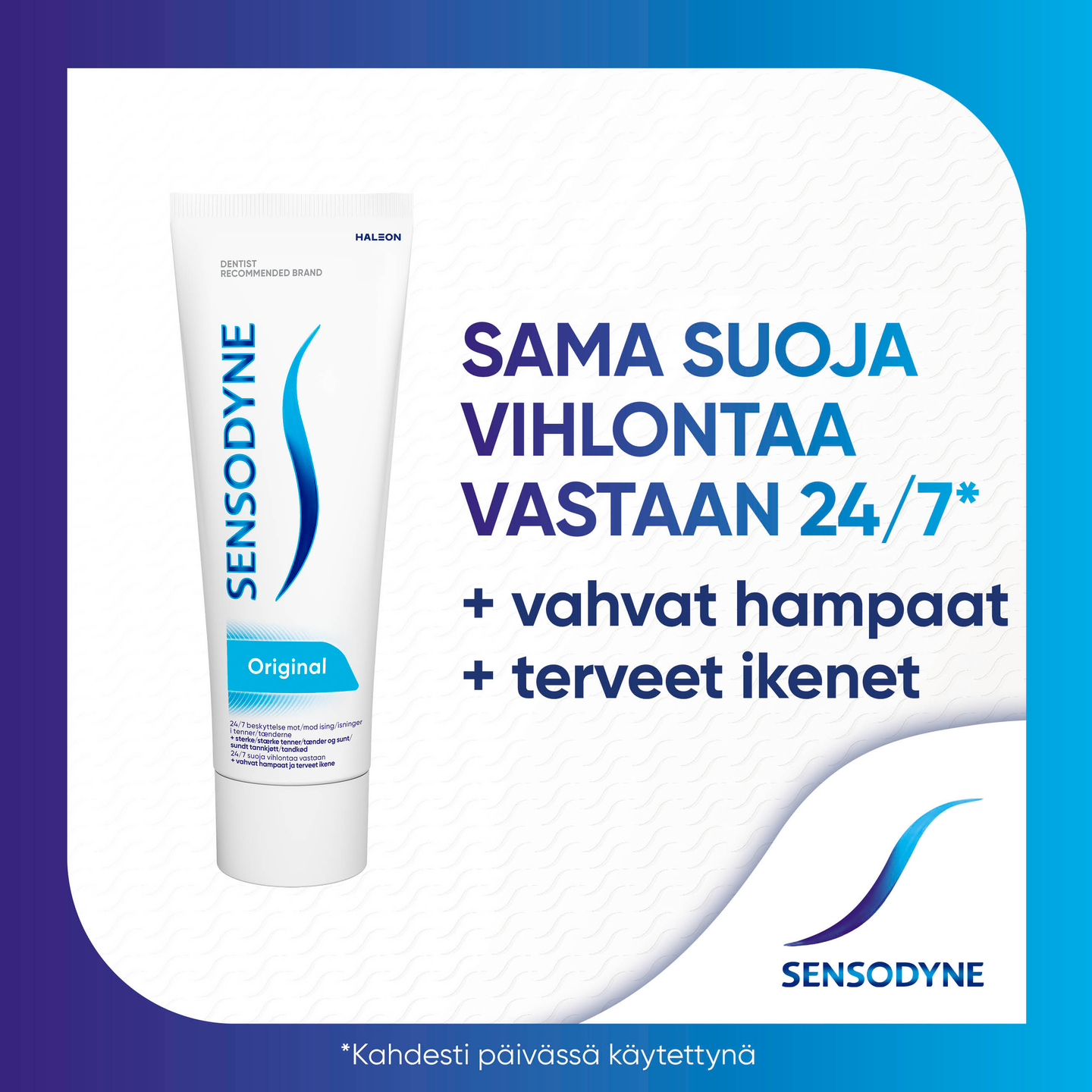 Sensodyne Original on päivittäiseen käyttöön tarkoitettu hammastahna, joka kahdesti päivässä käytettynä suojaa vihlontaa vastaan ja lievittää vihlontaa kliinisesti osoitetusti. Kahdesti päivässä käytettynä Sensodyne Original -hammastahna antaa ympärivuorokautista suojaa vihlontaa vastaa ja puhdistaa tehokkaasti. Sisältää fluoria, joka vahvistaa hammaskiillettä ja ehkäisee reikiintymistä. Sensodyne Original -tahnassa on raikas mintun maku. Käytä Sensodyne Original -hammastahnaa kahdesti päivässä, sillä se: • Antaa ympärivuorokautista suojaa vihlontaa vastaan • Poistaa plakkia ja sisältää reikiintymistä ehkäisevää fluoria • On mintunmakuinen ja tekee suusta puhtaan ja raikkaan tuntuisen.