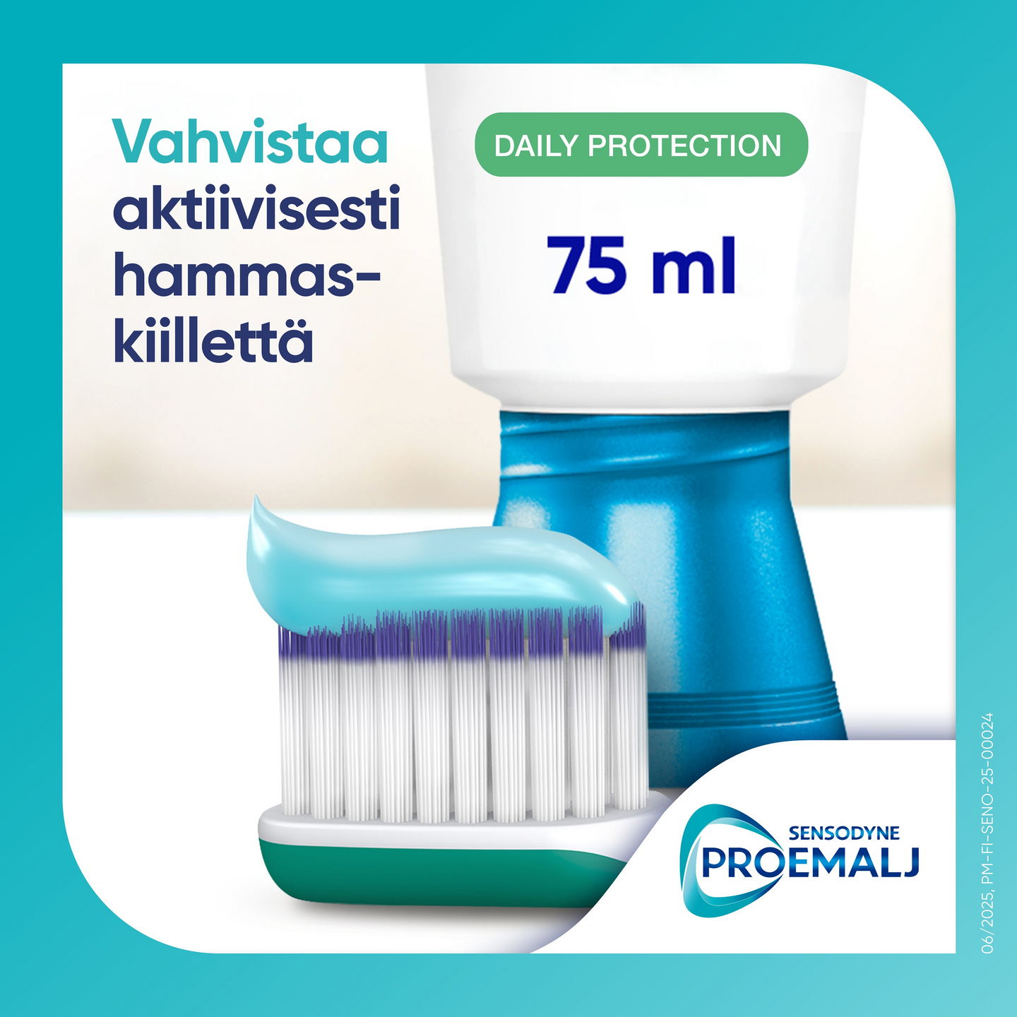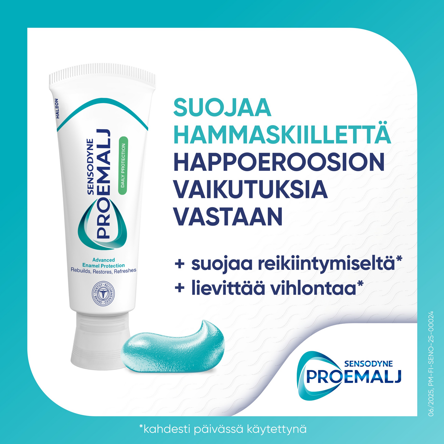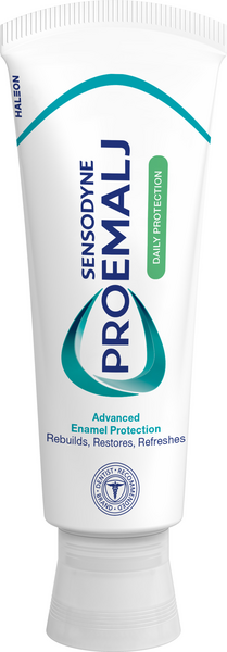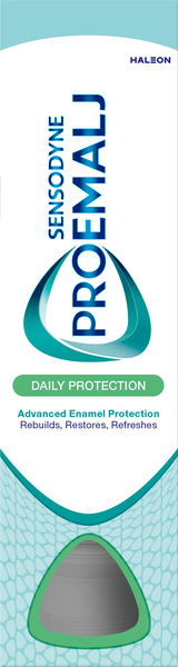 Sensodyne ProEmalj Daily Protection -hammastahna eheyttää ja vahvistaa hammaskiillettä remineralisoimalla heikentynyttä kiillettä kahdesti päivässä käytettynä. Käytä Sensodyne ProEmalj Daily Protection -hammastahnaa kahdesti päivässä, sillä se auttaa: • Eheyttämään hammaskiillettä ja auttaa tekemään hampaista vahvat, terveet ja luonnollisen valkoiset • Eheyttämään ruokien ja juomien happoja vastaan • Suojaamaan eroosion vaikutuksia vastaan • Ehkäisemään reikiintymistä • Suojaamaan vihlontaa vastaan • Edistämään hampaiden ja ikenien terveyttä • Pitämään suun puhtaana ja raikkaana • Raikastamaan hengitystä ainutlaatuisen makunsa ansiosta.