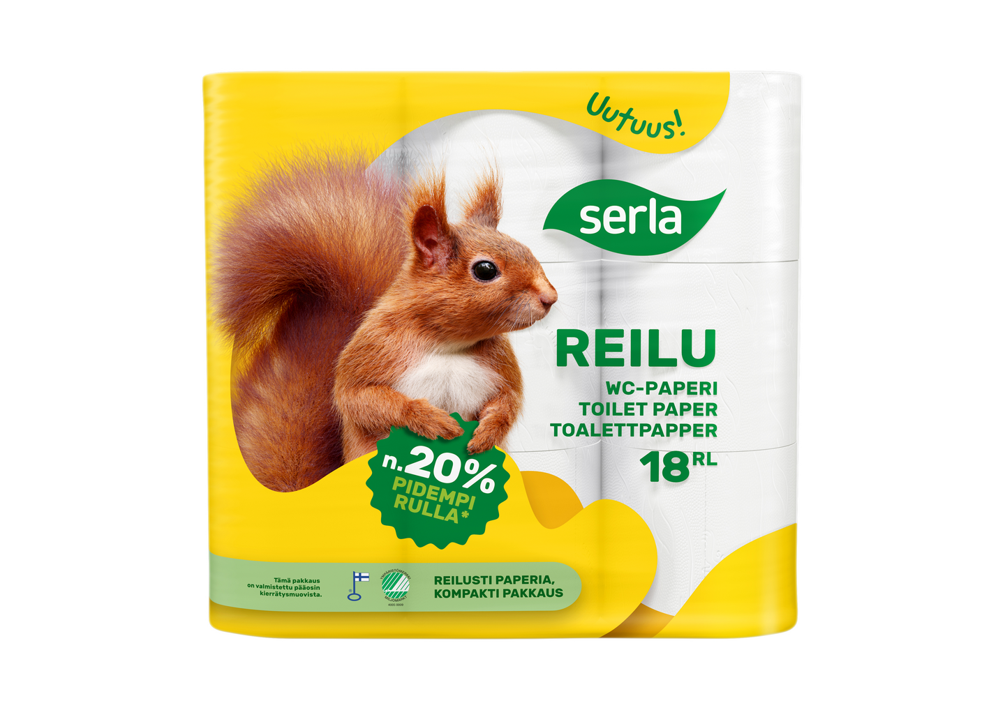 Serla Reilu WC-paperi sisältää 20% enemmän paperia jokaisessa rullassa – koska joskus enemmän todella on enemmän. Paperi on tuttua Serla-laatua ja fiksu valinta lompakollesi. Serla Reilu on valmistettu suomalaisesta ensikuidusta lähellä sinua Mäntän paperitehtaalla. Reilusti enemmän. Sehän on Serla.