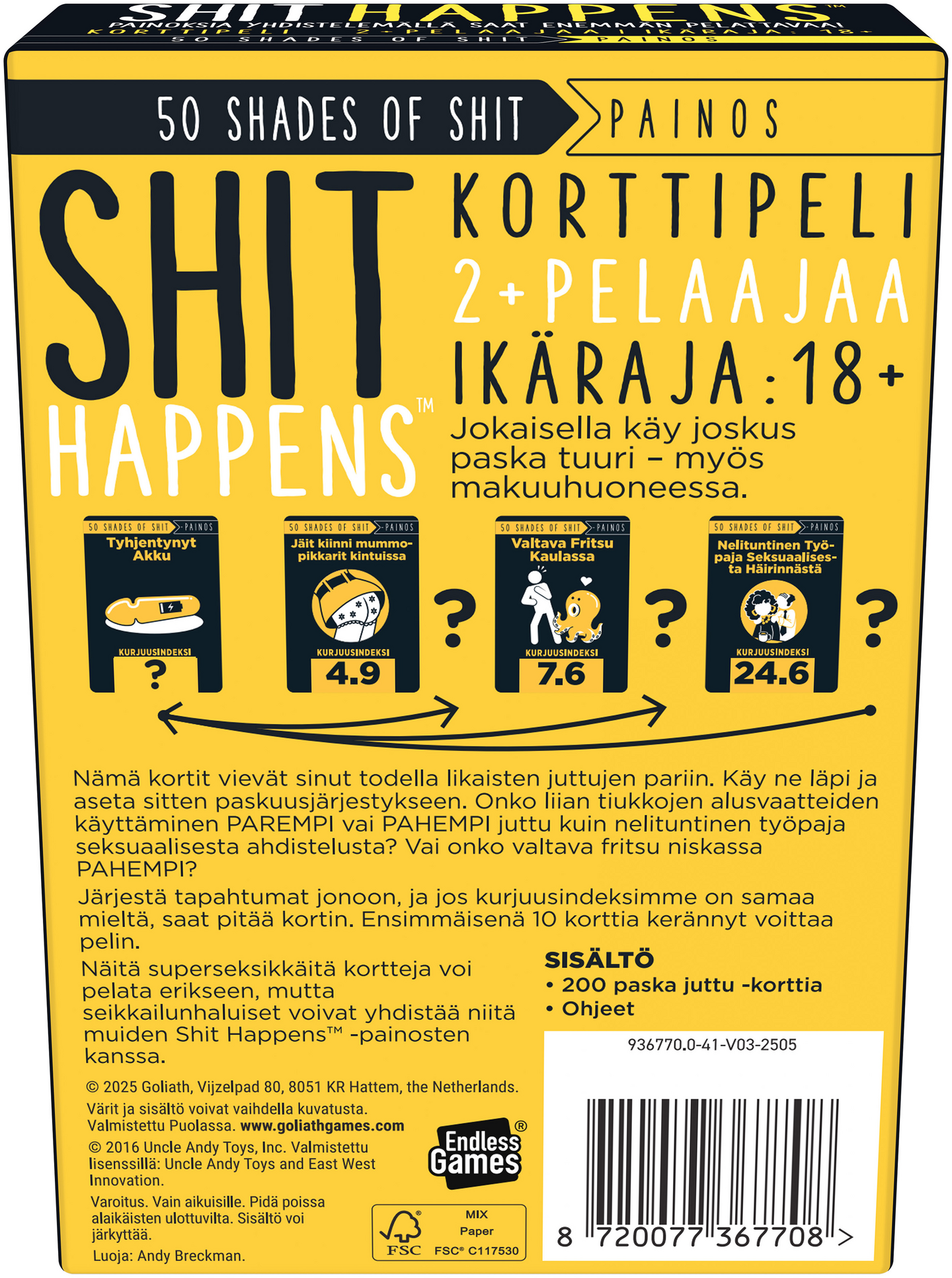 Aikuisten partypeli täynnä roisia huumoria! Tässä pelissä pelaajat arvioivat, vertailevat ja laittavat järjestykseen erilaisia kiusallisia tilanteita makuuhuoneen puolelta. Sis. 200 uutta korttia. Voidaan pelata itsenäisenä pelinä tai lisäosana. 18+