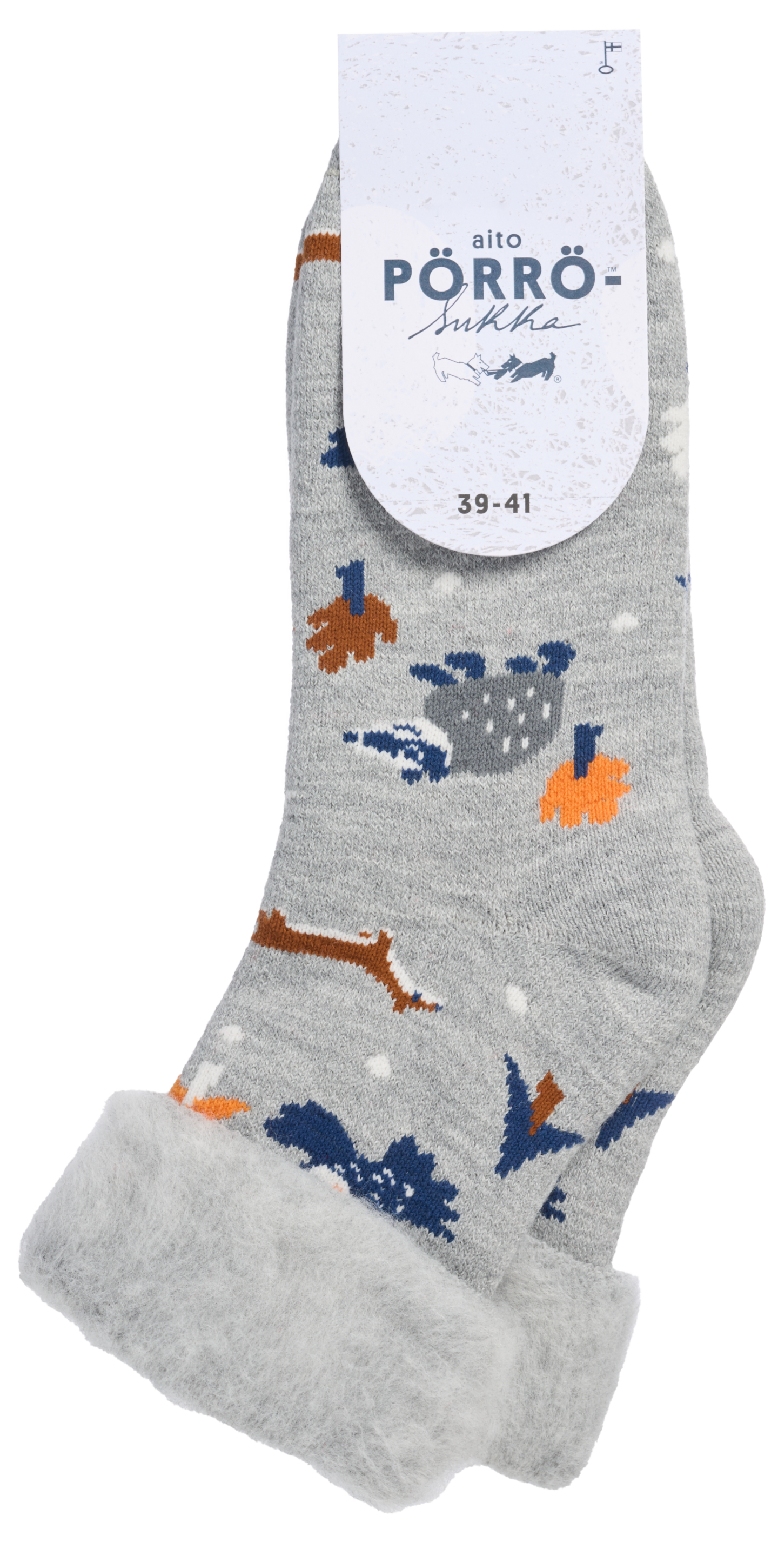 Sidoste naisten aito ja alkuperäinen, lämmin ja pehmeä perinteinen kuviollinen Pörrösukka® . Sukkien muhkea ja ylellisen pehmeä rakenne syntyy edelleen Tampereen tehtaalla vuosikymmenien ammattitaidolla ja kokemuksella. Varren pituus suorana 20 cm, Sukassa on valmiina käännös, jonka kanssa varren pituus 14 cm. Väri harmaa. Materiaalit Polyakryyli 80%, Polyamidi 20%.