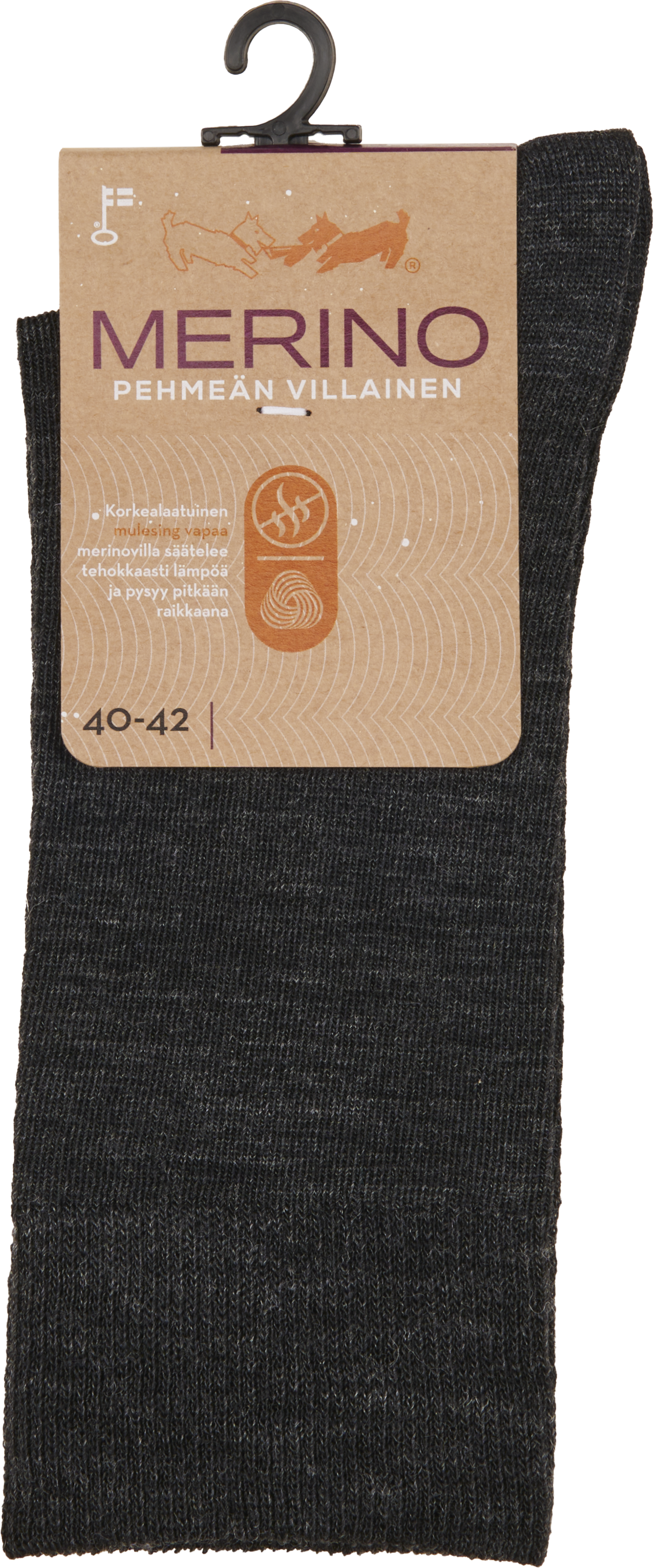 Miesten merinovillaiset sukat valmistetaan laadukkaasta eläinystävällisestä merinovillasta. Merinovilla siirtää tehokkaasti kosteutta jalkojen pinnasta ja säilyttää lämmön tunteen ja pitää jalat kuivana. Merinovilla on huomattavasti tavallista villa pehmeämpää ja tuntuu pehmeältä jalkaa vasten. Sukassa saumaton kärki, joka ei paina ihoa. Väri musta. Varren pituus 15 cm. Merinovilla 56%, Polyamidi 40%, Lycra 4%.