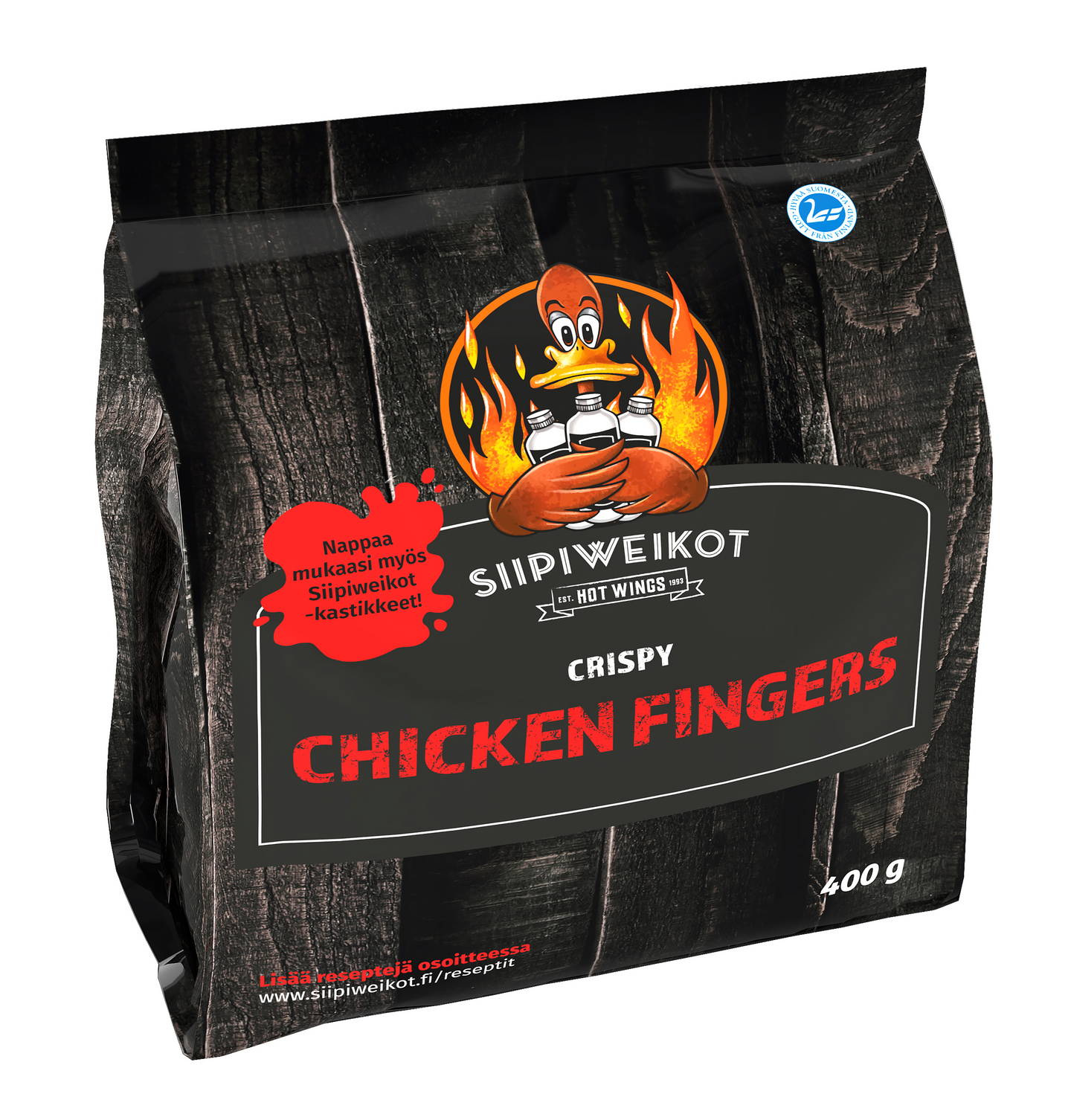 Siipiweikkojen Chicken Fingers paneroidut kanansisäfileet ovat rapeita ja mehukkaita herkuttelutuotteita, suomalaisilta Atrian tiloilta. Chicken Fingersit valmistuvat kätevästi uunissa, rasvakeittimessä tai airfryerissä. Katso tarkemmat valmistusohjeet paketin kyljestä. Täydellisen herkkuhetken saat dippaamalla valmiita fingersejä Siipiweikkojen siipikastikkeeseen. Kruunaa annoksesi lisäämällä siihen porkkanaa, kurkkua, selleriä ja muita dippivihanneksia. Tarjoa valmiit fingersit ja dippivihannekset maistuvan sinihomejuustodipin kanssa.