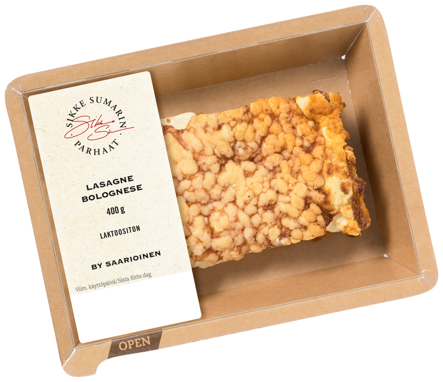 Keitimme klassisen tomaattipohjaisen jauhelihakastikkeen naudan- ja sianlihasta ja maustoimme sen yrteillä ja punaviinillä. Kokosimme lasagnen kerroksittain lihakastikkeen kanssa ja kuorrutimme bechamel-kastikkeella ja reilulla määrällä juustoa. Tämä reilun kokoinen annoslasagne on kehitetty Sikke Sumarin reseptillä ja tuo makumuistot Italiasta. Laktoositon.